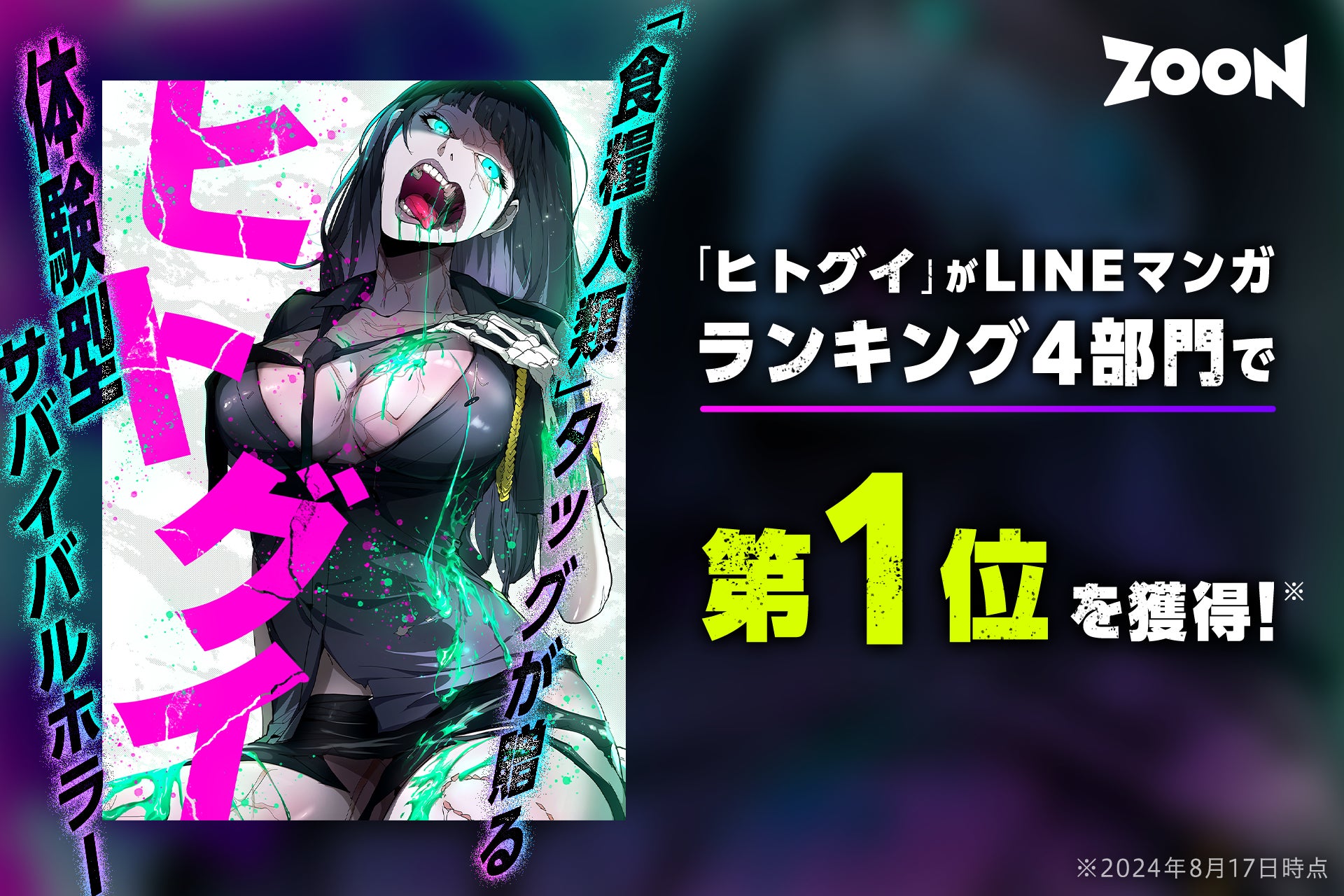 漫画コンテンツスタジオ「STUDIO ZOON」が手がけるオリジナル縦読み漫画『ヒトグイ』が、LINEマンガの「男性ランキング」など4部門で第1位を獲得!
