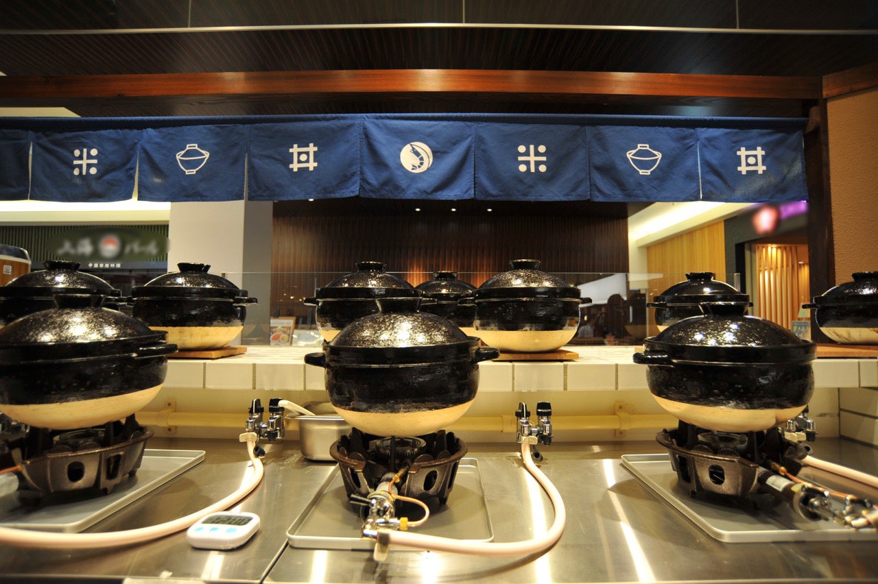 お米は、天ぷらに合うように、石川県産コシヒカリにゆめみずほをブレンドした独自配合です。土鍋炊きにこだわっており、店内カウンターには土鍋がズラリと並びます。直火で炊き上げたお米は、ふっくらと炊きあがり、一粒一粒が立ったツヤツヤな仕上がりで甘さが引き出されており、最後の一粒まで美味しく召し上がっていただけます。