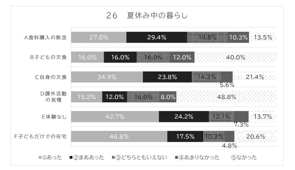 「まあ」を含めると、回答者の6割近くが「A お米や食料を買えないことがあった」といいます。また、およそ三人の一人の「子ども」が、「親」にいたっては二人に一人以上が「欠食」の経験を持っておられます。しかも、いずれも昨年より値は高くなっています。