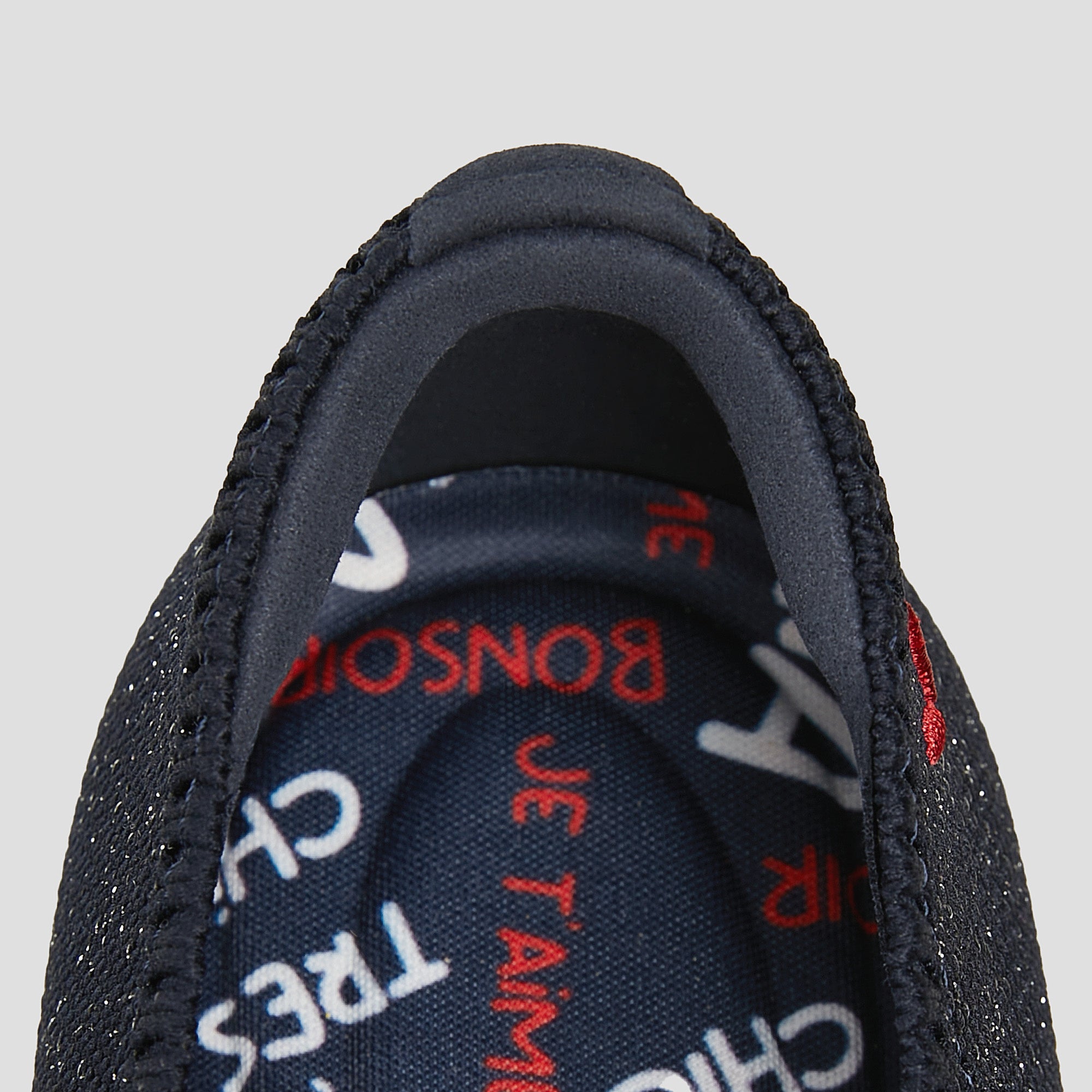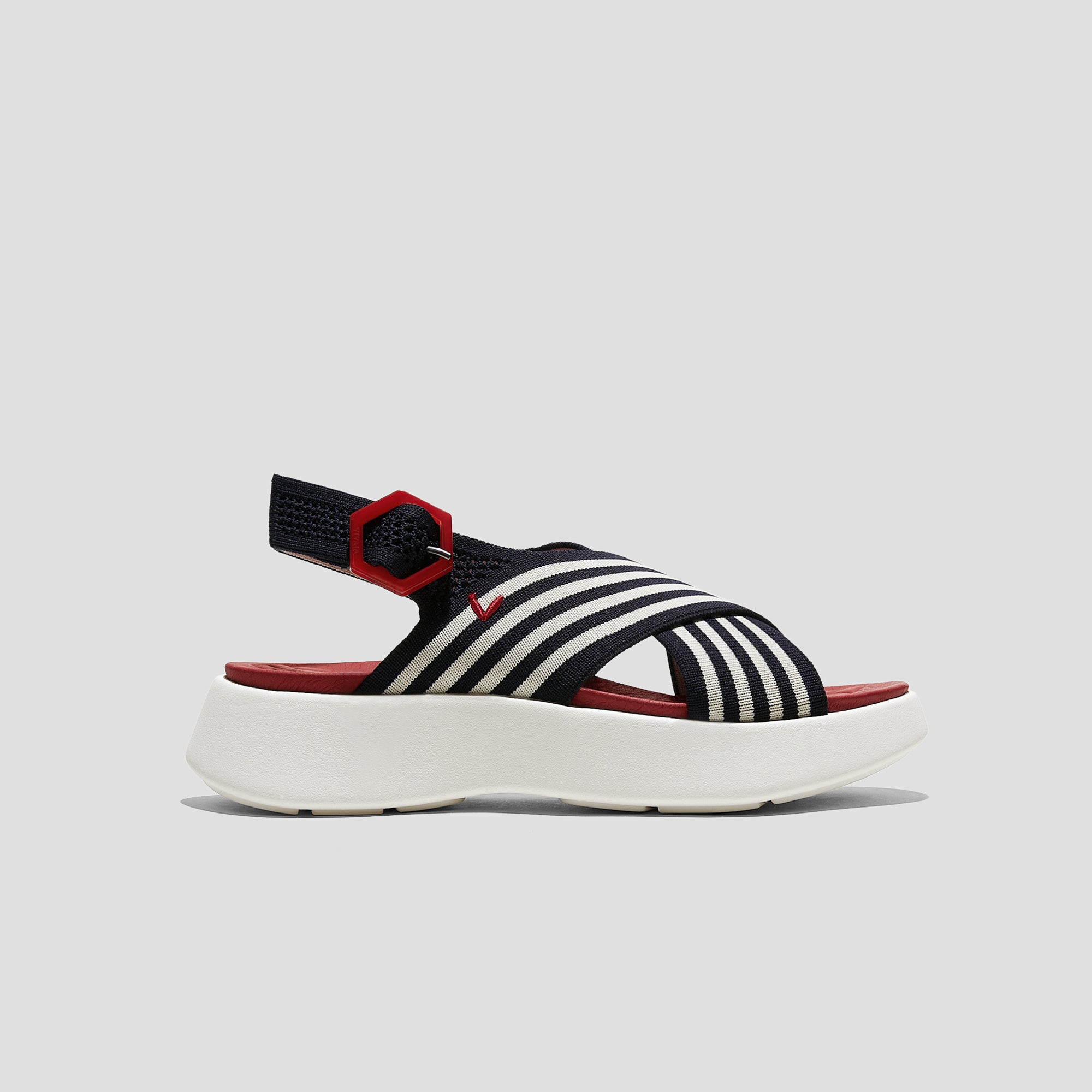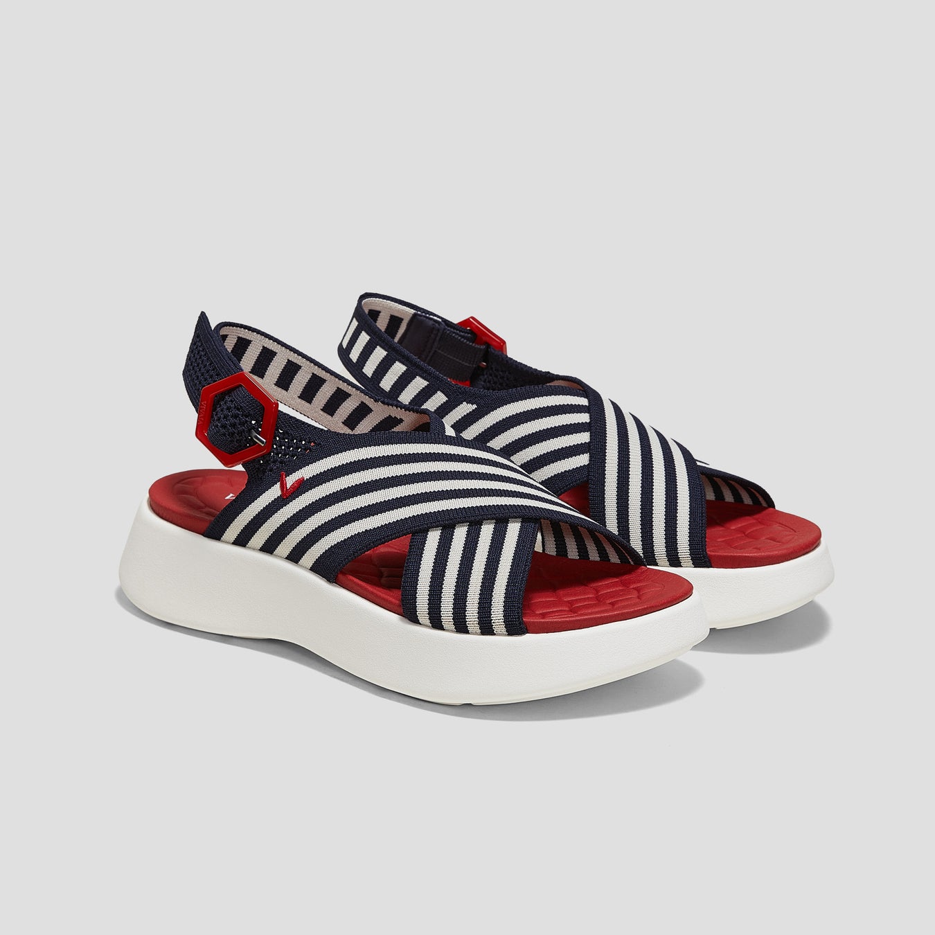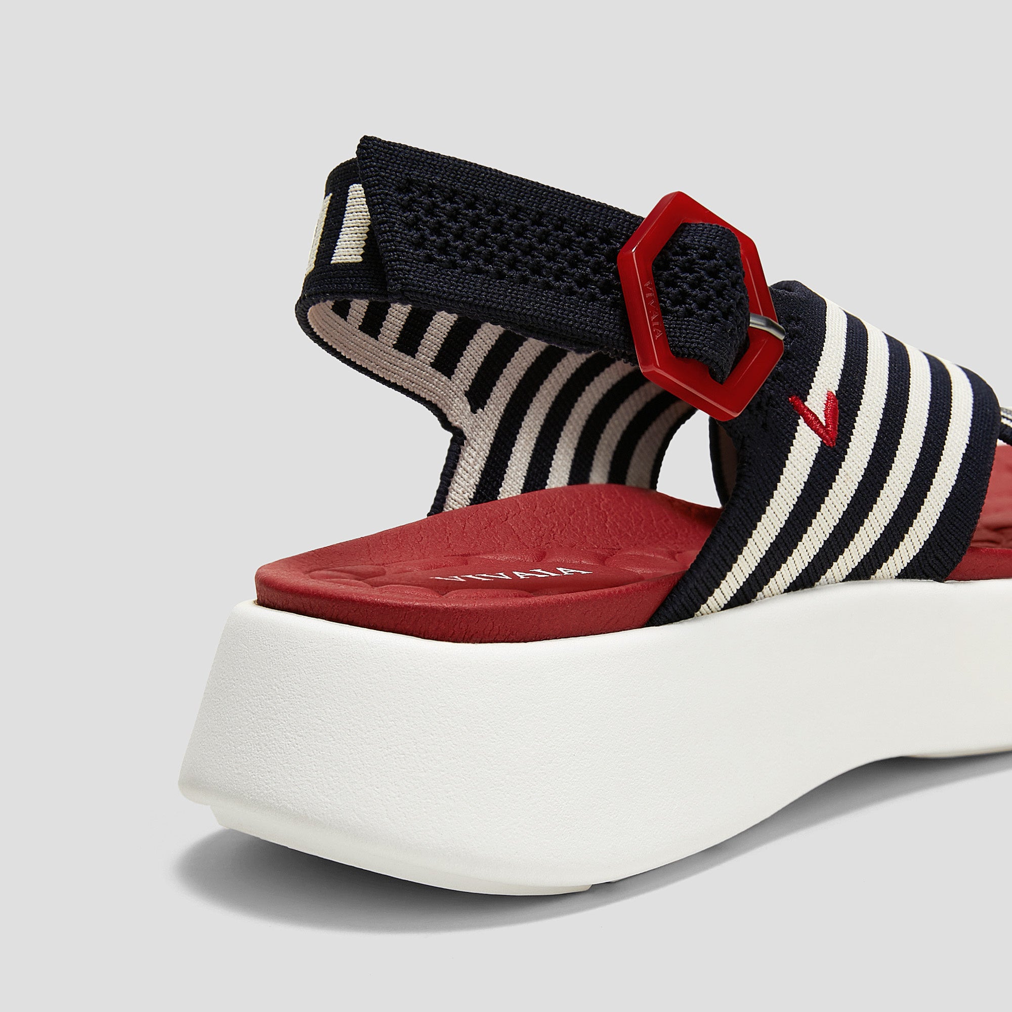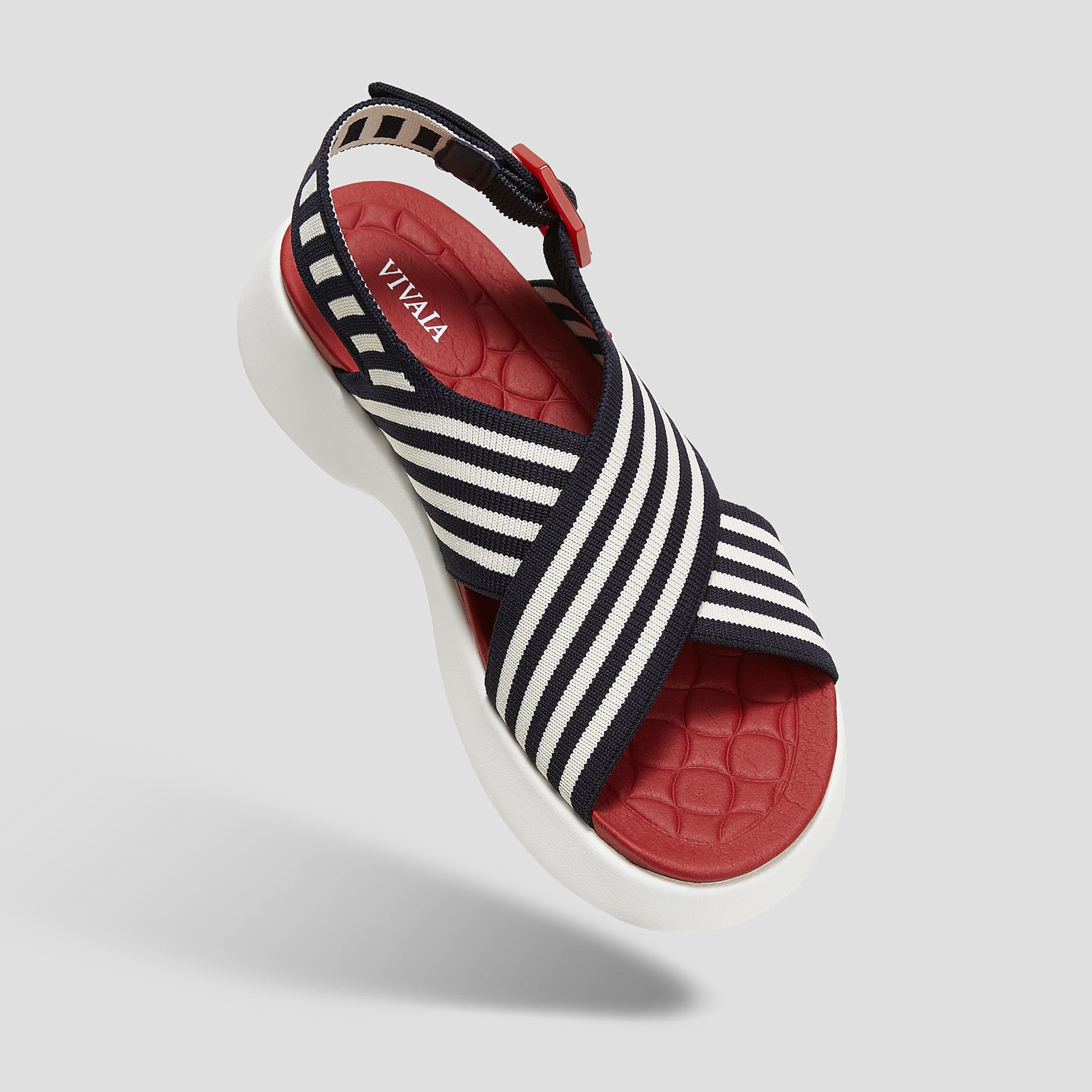 ネイビーのストライプに白のソールと赤いインソールがフランス国旗のような上品さを演出します。VIVAIA独自のインソールで、一日中快適な履き心地を提供し、両足をしっかりと包み込むようなフィット感が足の形になじみ、一日中歩き回っても疲れ知らずな一足です。