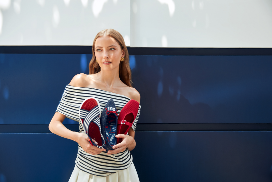 今回の限定デザインは、フランス国旗からインスパイアされており、VIVAIAの快適な履き心地、デザイン性、そして多様性を表現しています。また、ネイビー、赤、白の3色がフランス国旗のような上品さとプライドを感じさせるデザインとなっています。
