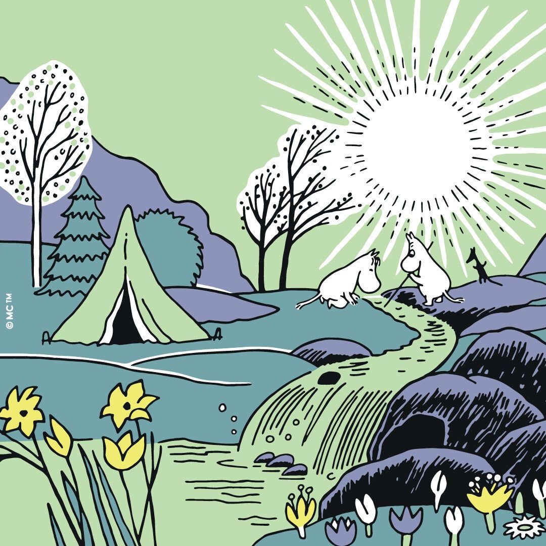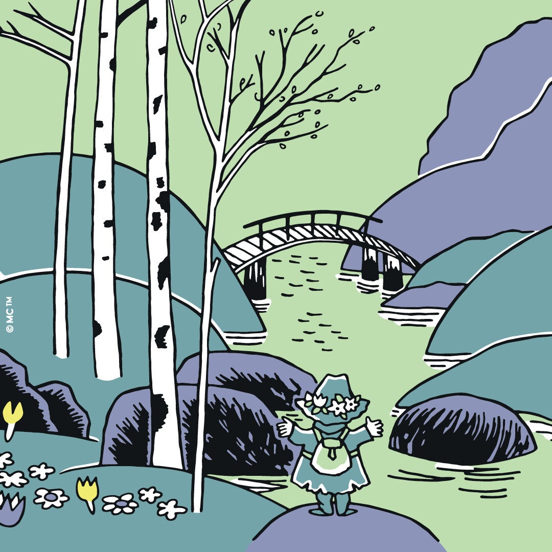 新しいマグのイラストでは、トーベ・スロッテはトーベ・ヤンソンのオリジナルの水彩画をもとにスナフキンを描き直し、帽子に花を添えました。この水彩画は、1993年にスウェーデン語で出版されたムーミンの歌集『Visor från Mumindalen』に登場する、春の歌を描いたものです。マグに描かれているムーミン、スノークのおじょうさん、小川などは、コミックス『やっかいな冬』(1955年)から、水仙は『ムーミン谷の冬』から用いられています。