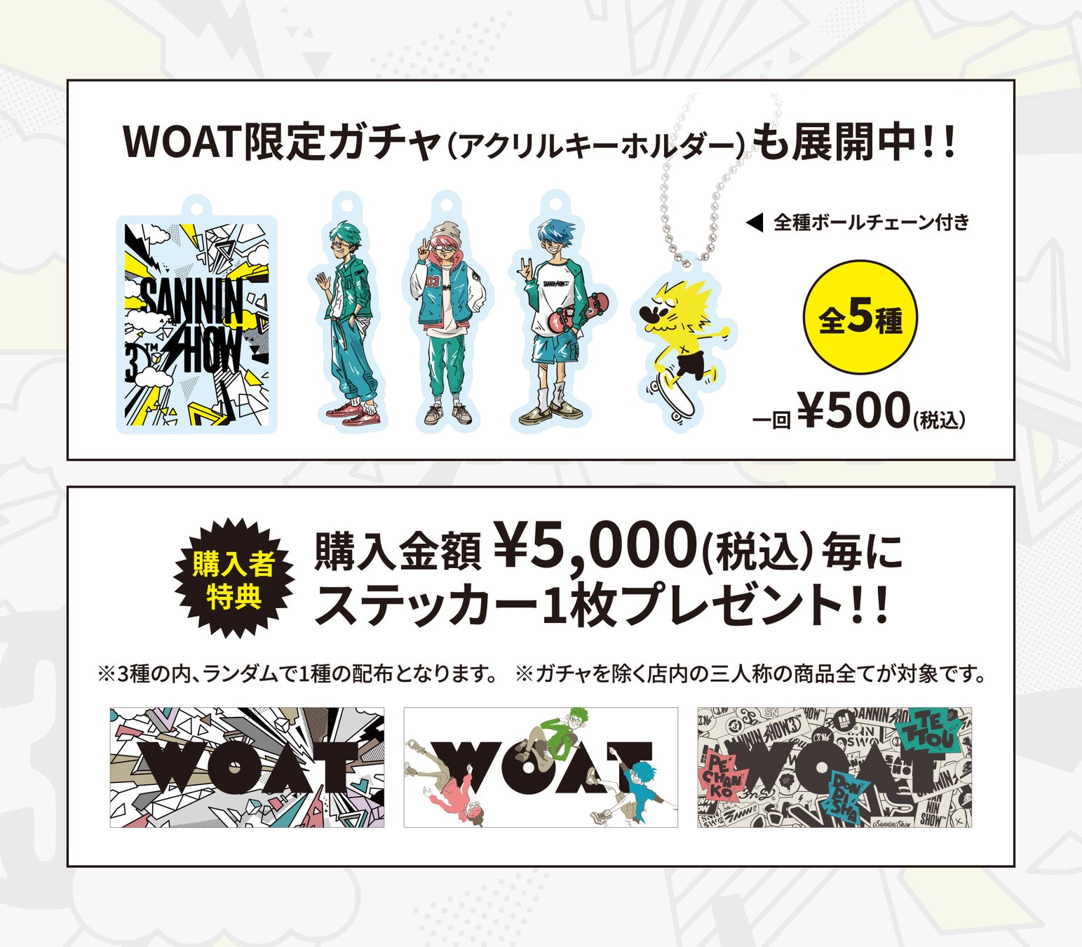 オリジナルグッズ20点の販売の他、WOAT限定ガチャ(アクリルキーホルダー)の展開と、購入者特典として購入金額5,000円(税込)毎にWOAT限定ステッカー1枚をプレゼントいたします。