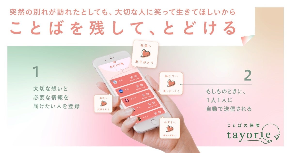 tayoriが運営する「ことばの保険 tayorie」は、“もしものとき”に備えて大切な人へメッセージや情報を届けることができるWEBサービスです。