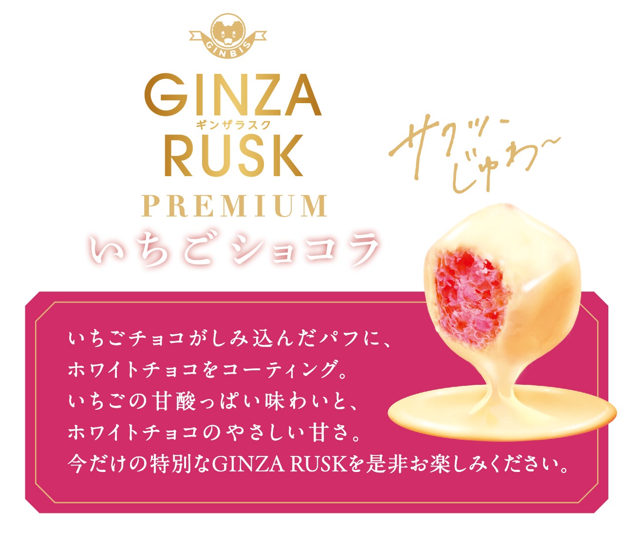 「GINZA RUSK PREMIUM いちごショコラ」は、いちごチョコがしみ込んだパフにさらにチョコをコーティングした贅沢な一品です。