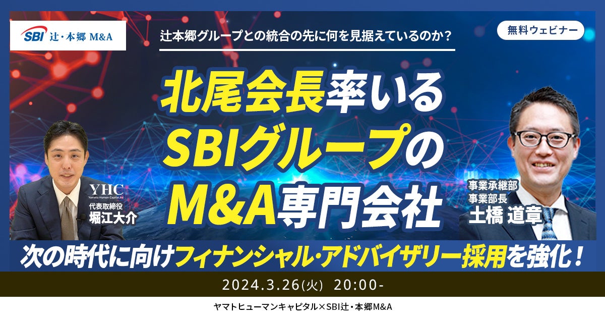 ヤマトヒューマンキャピタル株式会社(本社:東京都千代田区、代表取締役:堀江 大介)は、2024年3月26日(火)20:00よりオンラインにて、SBI 辻・本郷M&A株式会社の荒川氏、土橋氏、長谷川氏にご登壇いただくウェビナー『 北尾会長率いるSBIグループのM&A専門会社。辻本郷グループの同業との統合の先に何を見据えているのか?』を開催いたします。