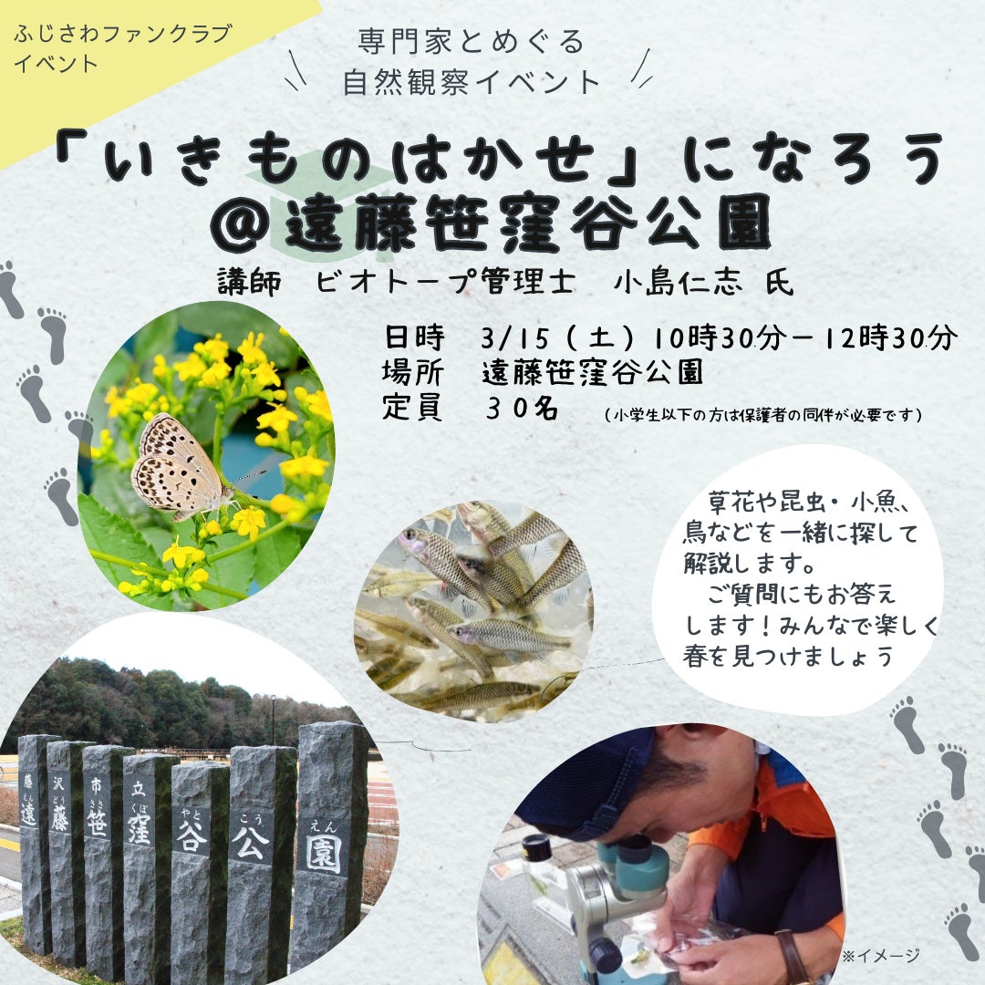 「ふじさわファンクラブ」(藤沢市)では、ふじさわファンクラブ会員を対象に、早春の藤沢の自然に触れ、環境意識を高め、地元への愛着をより深めてもらうための参加型イベント「ふじさわの【いきものはかせ】になろう!」を藤沢市・遠藤笹窪谷公園にて3月15日(土)に、藤沢市シティプロモーションの一環で開催します。