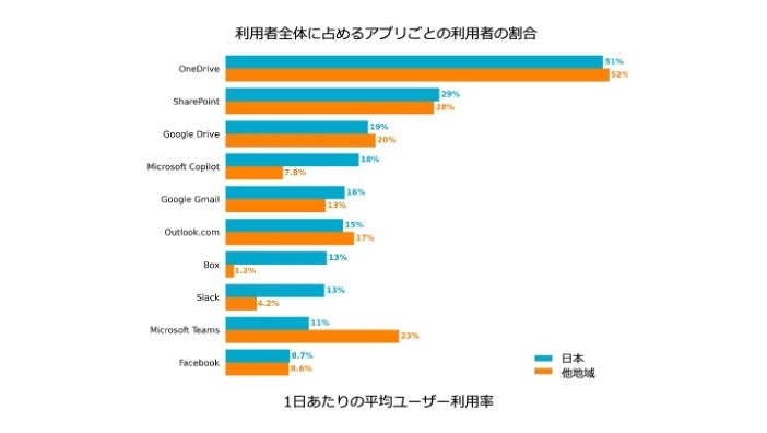 他の地域と比べ、日本ではマイクロソフトのCopilotなどAIを搭載したアプリケーションの利用率が特に高い(日本18%、他の地域7.8%)。