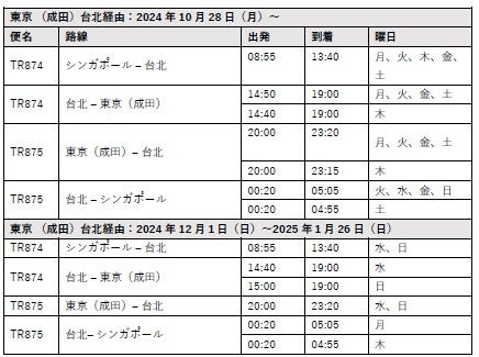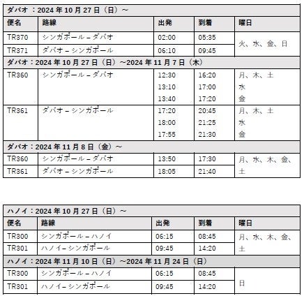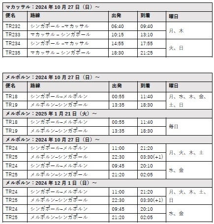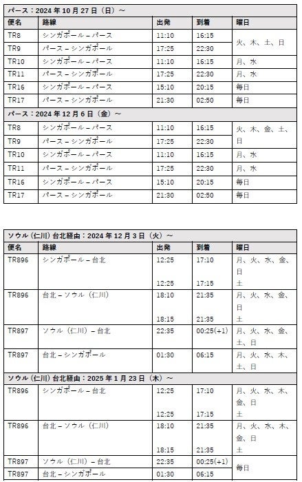スクート(日本支社:東京都千代田区、日本支社⾧:比留間盛夫)は、2024年の冬期運航フライトスケジュールを発表しました。2024年11月より、シンガポール - チェンマイ線が週10便から週11便に、シンガポール - ハノイ線が週5便から週6便にそれぞれ増便されます。また、2024年12月からはシンガポール - パース線が週13便から週14便に増便されるほか、シンガポール - メルボルン線も週12便から週13便に増便され、2025年1月からは1日2便体制となる予定です。