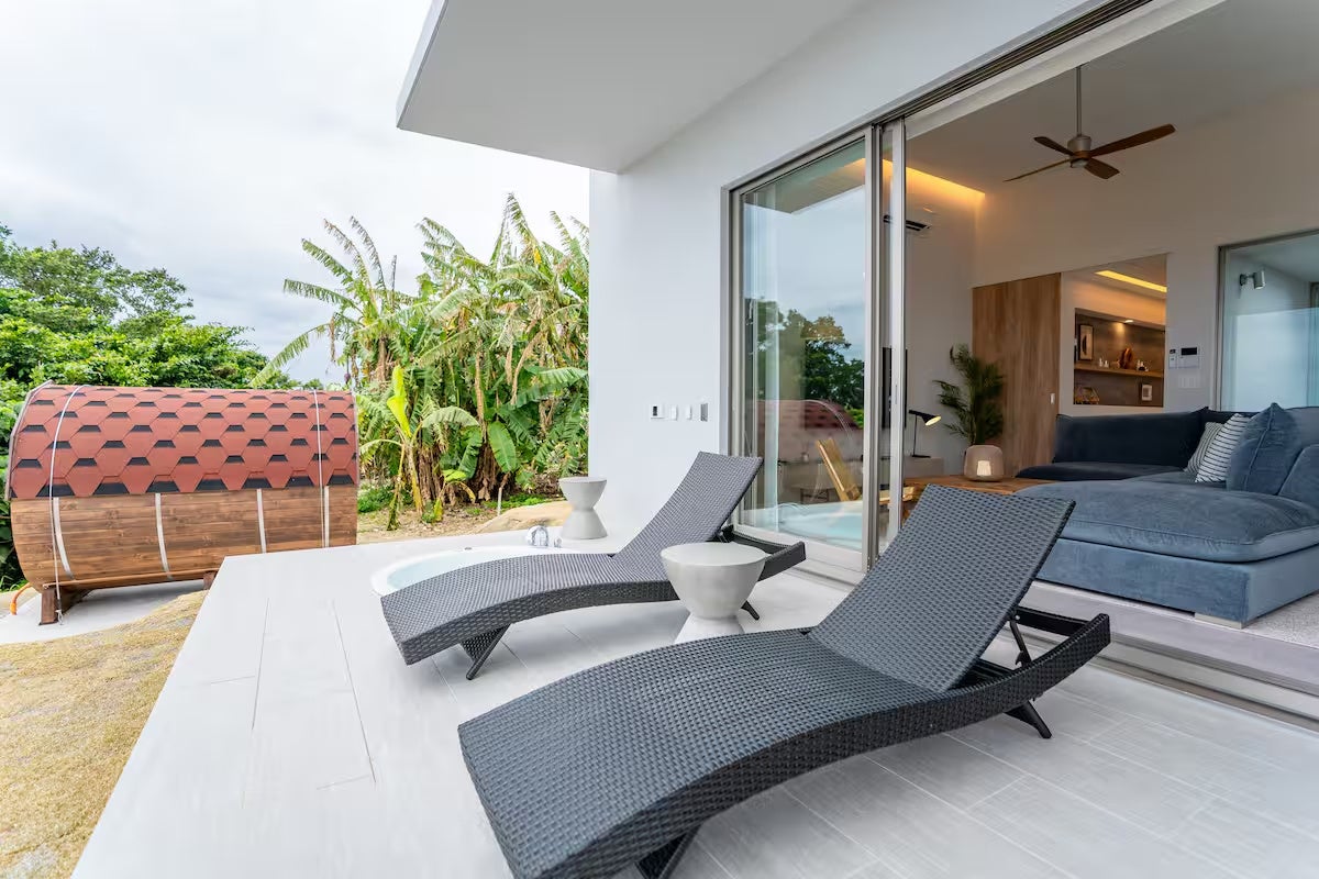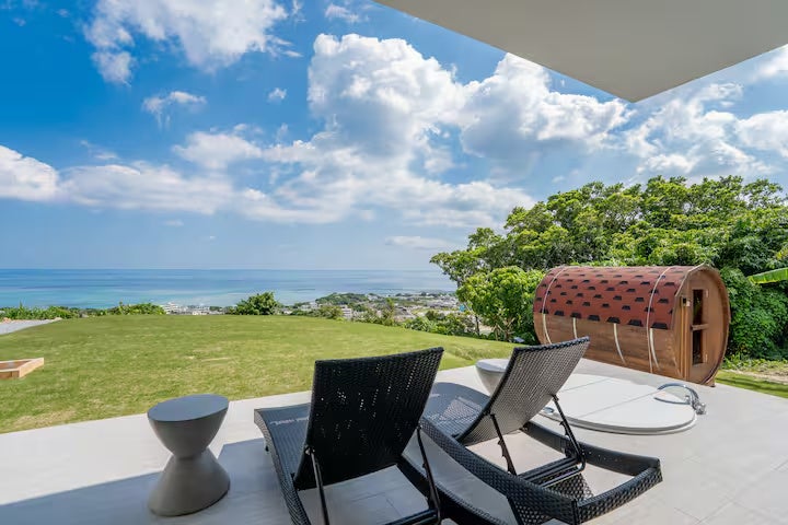 テラスから一面の海を眺めながら、ジャグジーやサウナでリラックスできます。