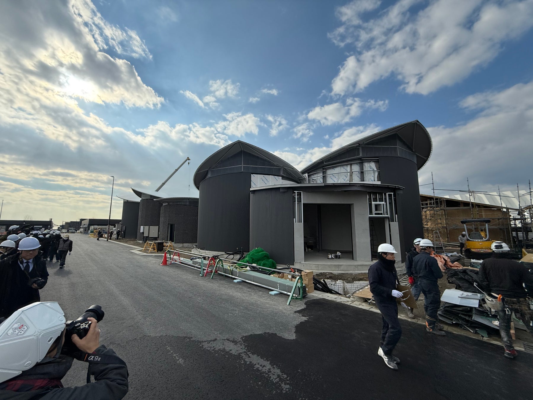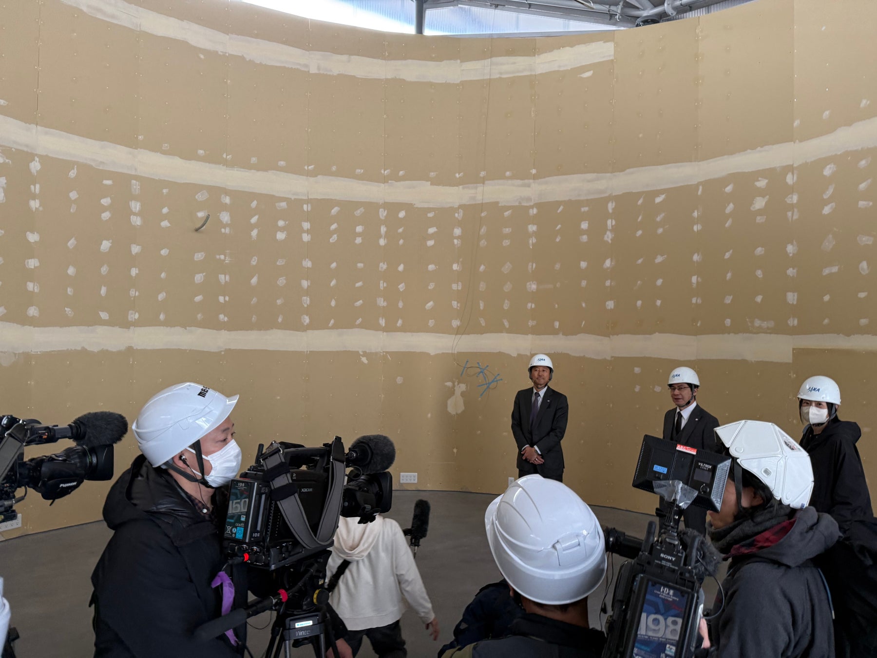 また、記者会見のあとには協賛者と報道関係者は夢洲会場へ向かい、フューチャーライフヴィレッジの建築状況を見学。2月以降順次開始されるそれぞれの展示空間の制作・施工に向けて入念に建物を確認していきました。JAXAの佐藤寿晃理事は、「幅約10メートル、高さ約3メートルの大型LEDカーブビジョンをここに設置し、JAXAの月面の活動をお伝えしていく。没入感のある演出を作っていく」と、意気込みました。