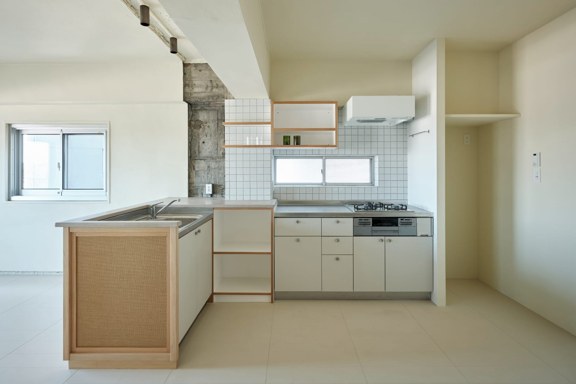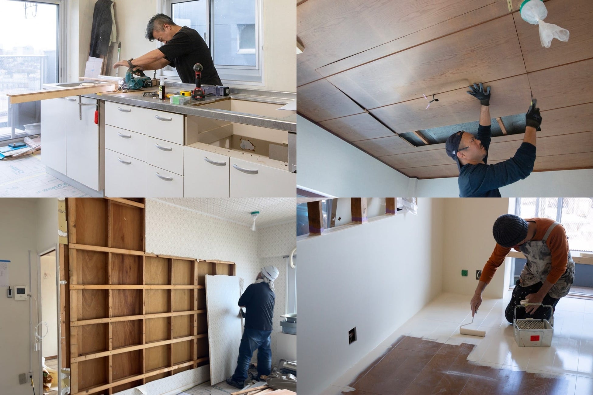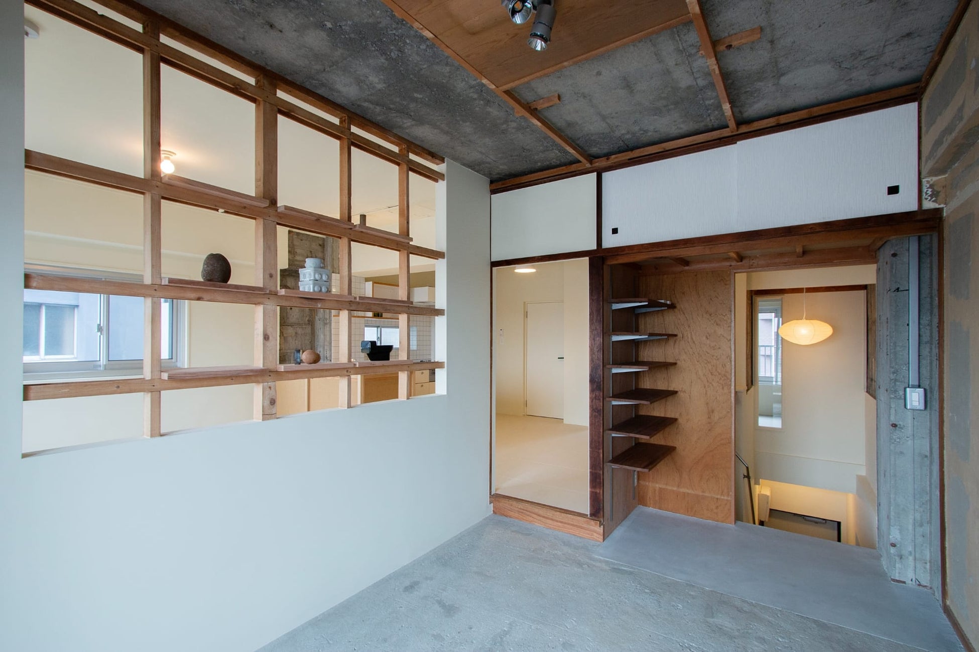 舞台となったのは、築57年のマンション。2LDKのメゾネット住戸で、各部位は比較的新しく機能面としては継続使用が可能な状態でありながらも、断片的なリフォームにより意匠の統一性を欠いていました。現場の職人のアイデアやスキル、コンセプトへの共感を軸に、既存内装建材、設備を撤去せずに活用する手法を見出しながら、全体を再構築。解体による廃棄物や下地の再制作費用を軽減すると同時に、スケルトンを前提としない新たなリノベーション手法を見出しました。