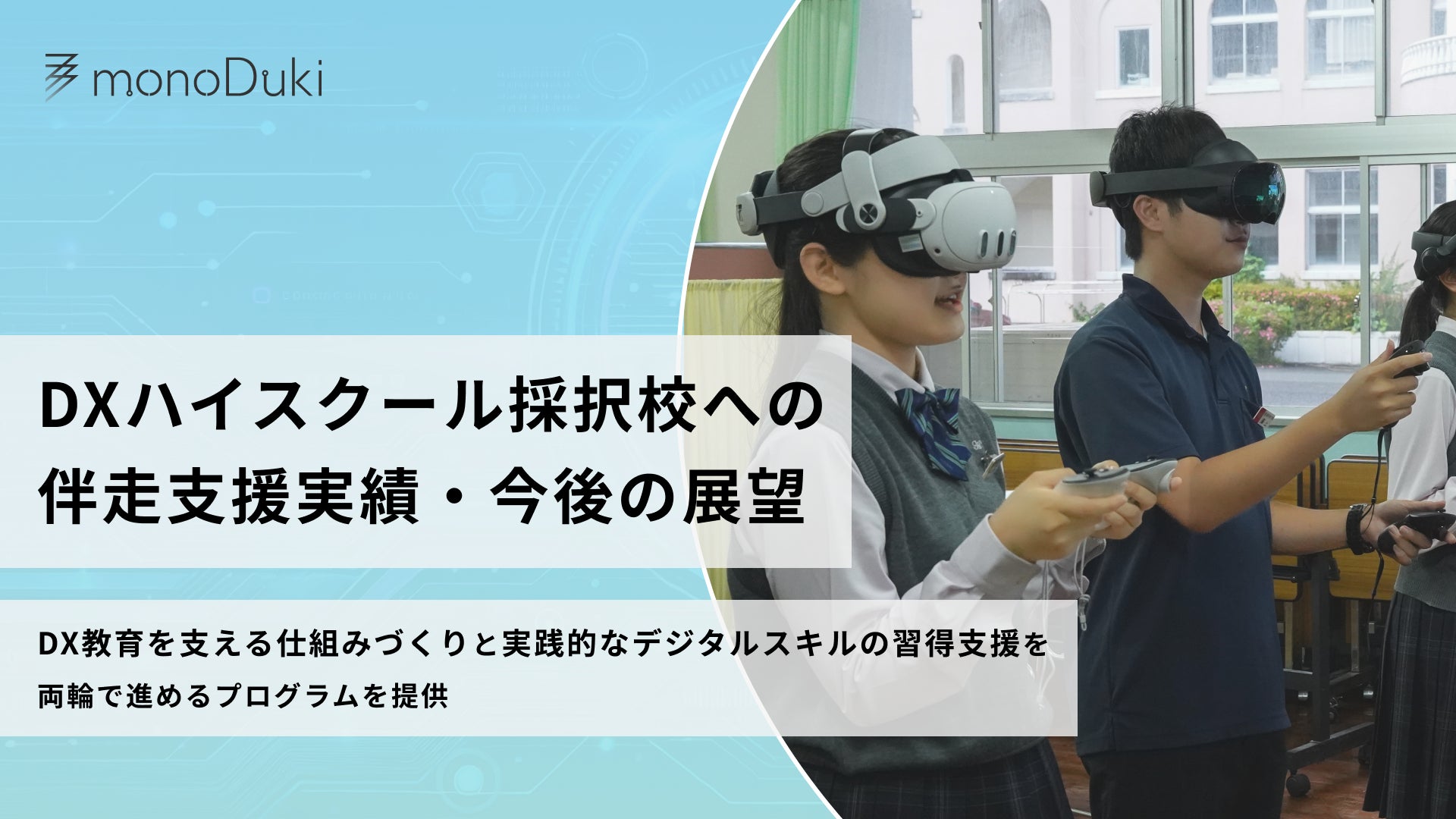 そのため、monoDukiでは「DX教育を支える仕組みづくり」と「実践的なデジタルスキルの習得支援」 を両輪で進めるプログラムを、学校へのヒアリングを元に計画・提供し、DXハイスクール採択校の教育支援を行っています。