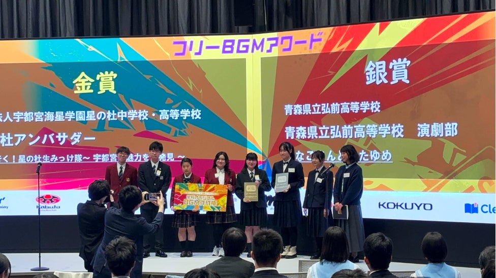 フリーBGM協会と審査員のみなさまとの協議の結果、学校法人宇都宮海星学園 星の杜中学校・高等学校が制作した「LRTで行く!星の杜生みっけ隊〜宇都宮の魅力を大発見〜」に「フリーBGMアワード」金賞を、青森県立弘前高等学校が制作した「はなこさんとみたゆめ」に銀賞を授与致します。加えて、学校法人宇都宮海星学園 星の杜中学校・高等学校には、副賞として「学校オリジナルBGM制作」の機会を授与し、鷹尾まさきさまにご協力をいただきながら今後制作が進められてまいります。
