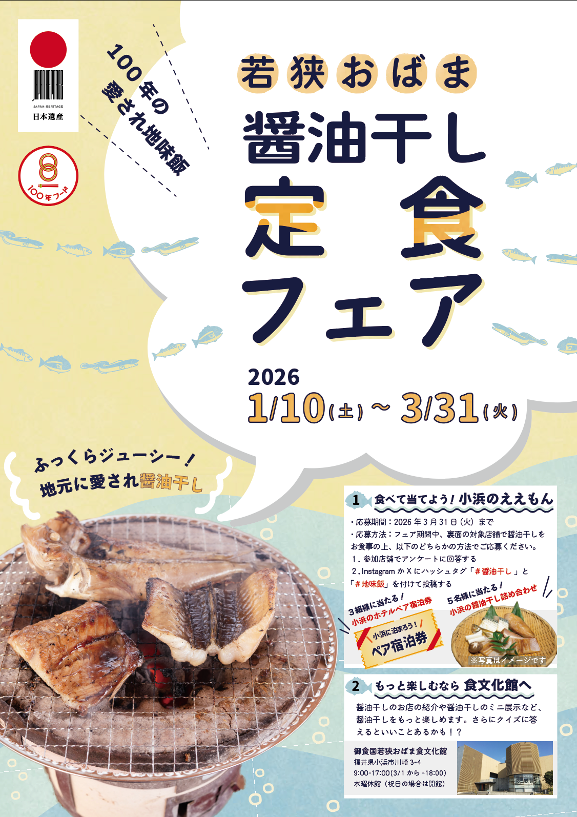 小浜市・若狭町日本遺産推進協議会と一般社団法人若狭おばま観光協会は、この地域に根付く伝統食に改めて光を当てるため、「ひものの日」である令和8年1月10日(土)から3月31日(火)まで、小浜市内の飲食店8店舗にて「100年の愛され地味飯 若狭おばま醤油干し定食フェア」を開催します。