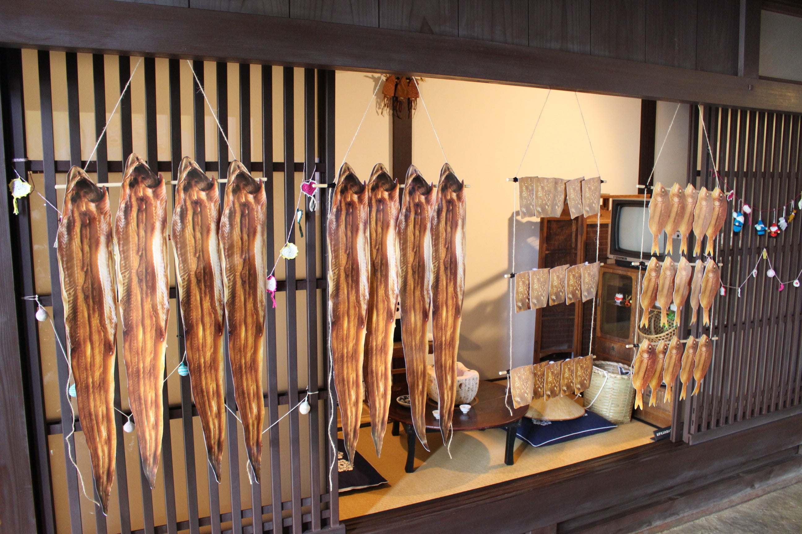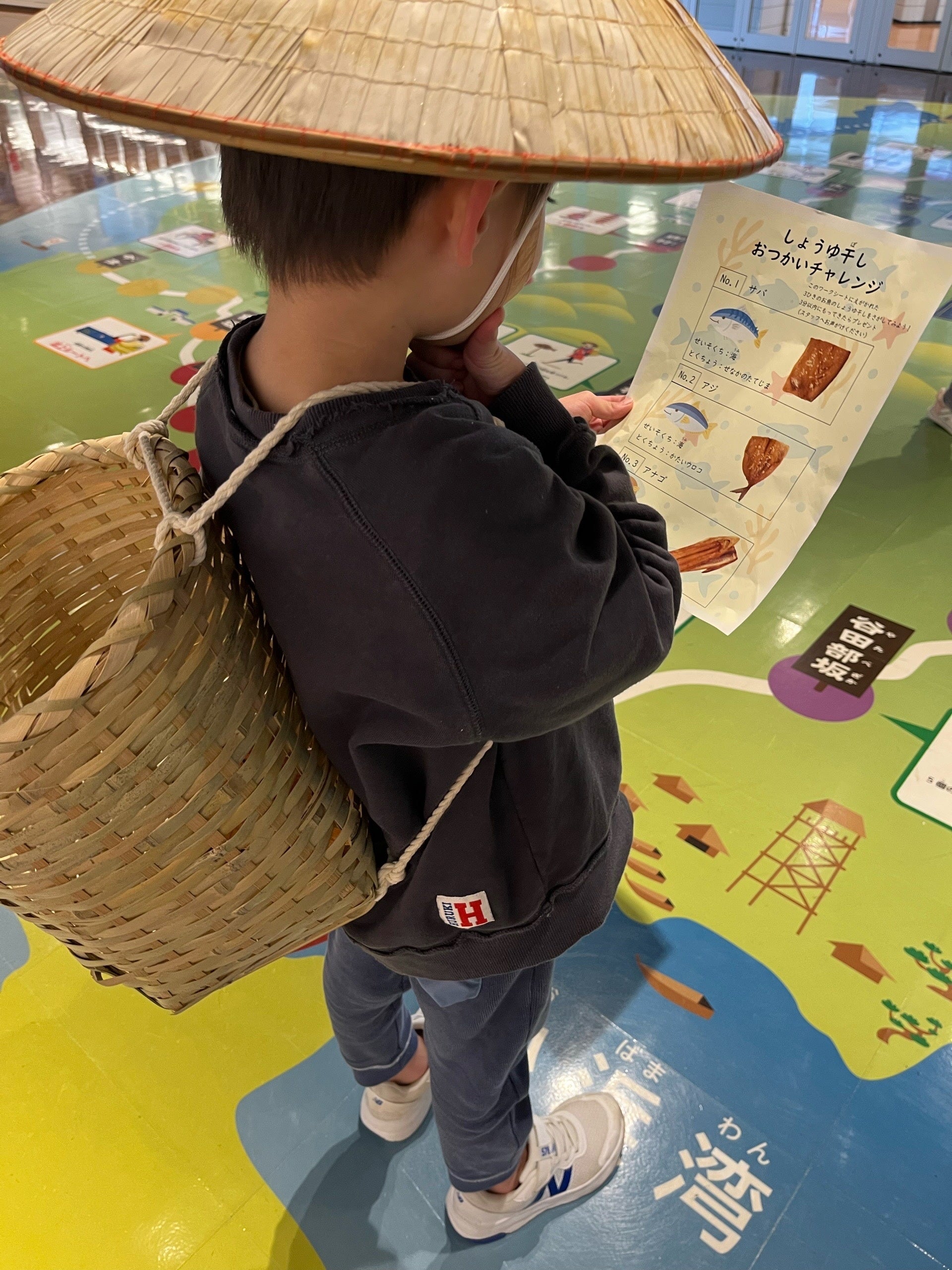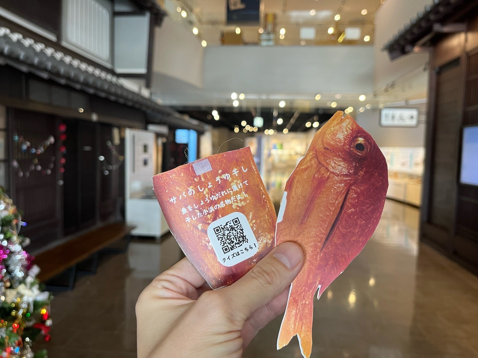 親子で楽しめる!館内に吊るされた干物カードの中から、お題となる魚を探し出す体験型ゲームです。行商人風の衣装を身にまとっての記念撮影も楽しめる、子どもから大人まで参加可能な参加型コンテンツです。