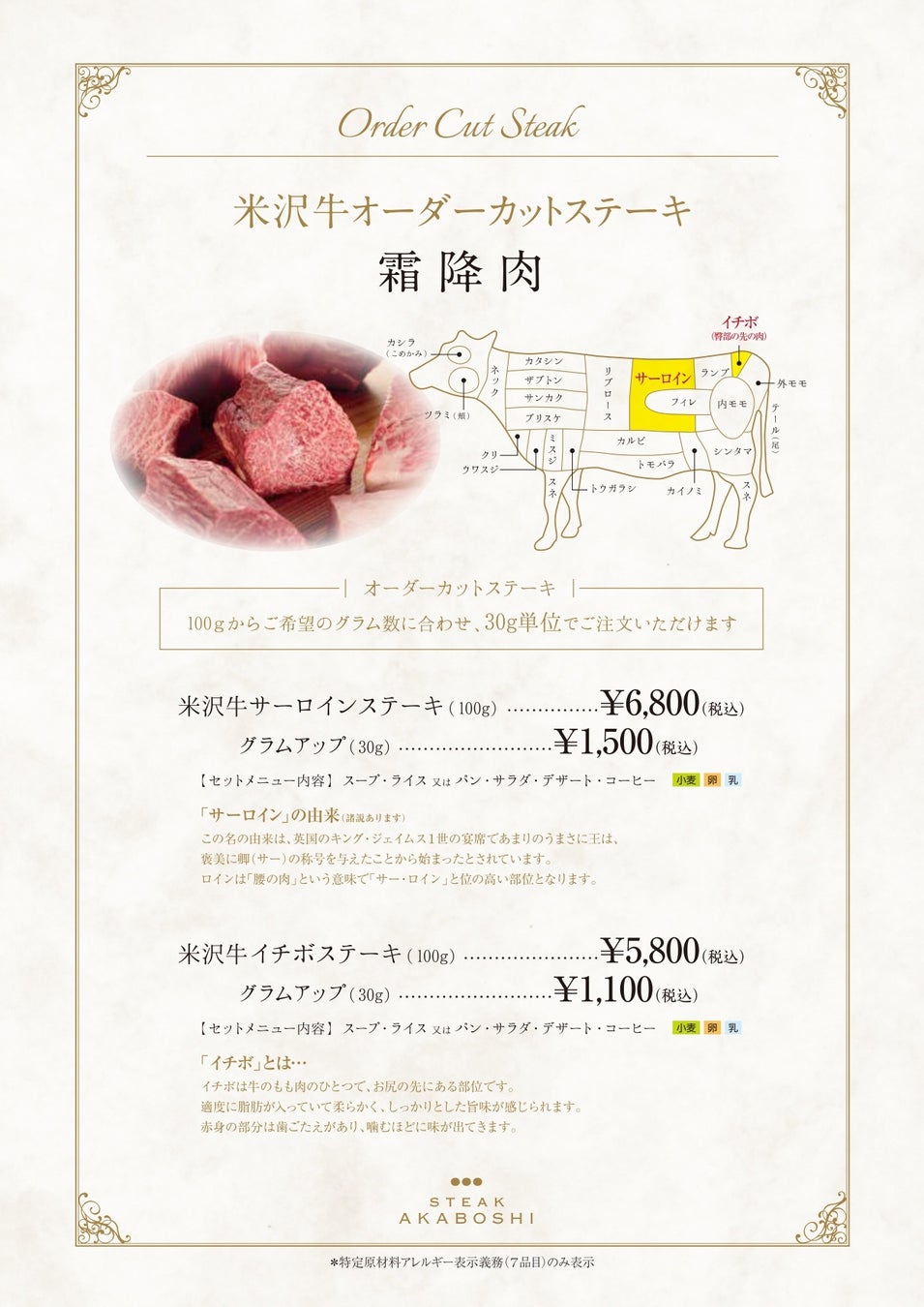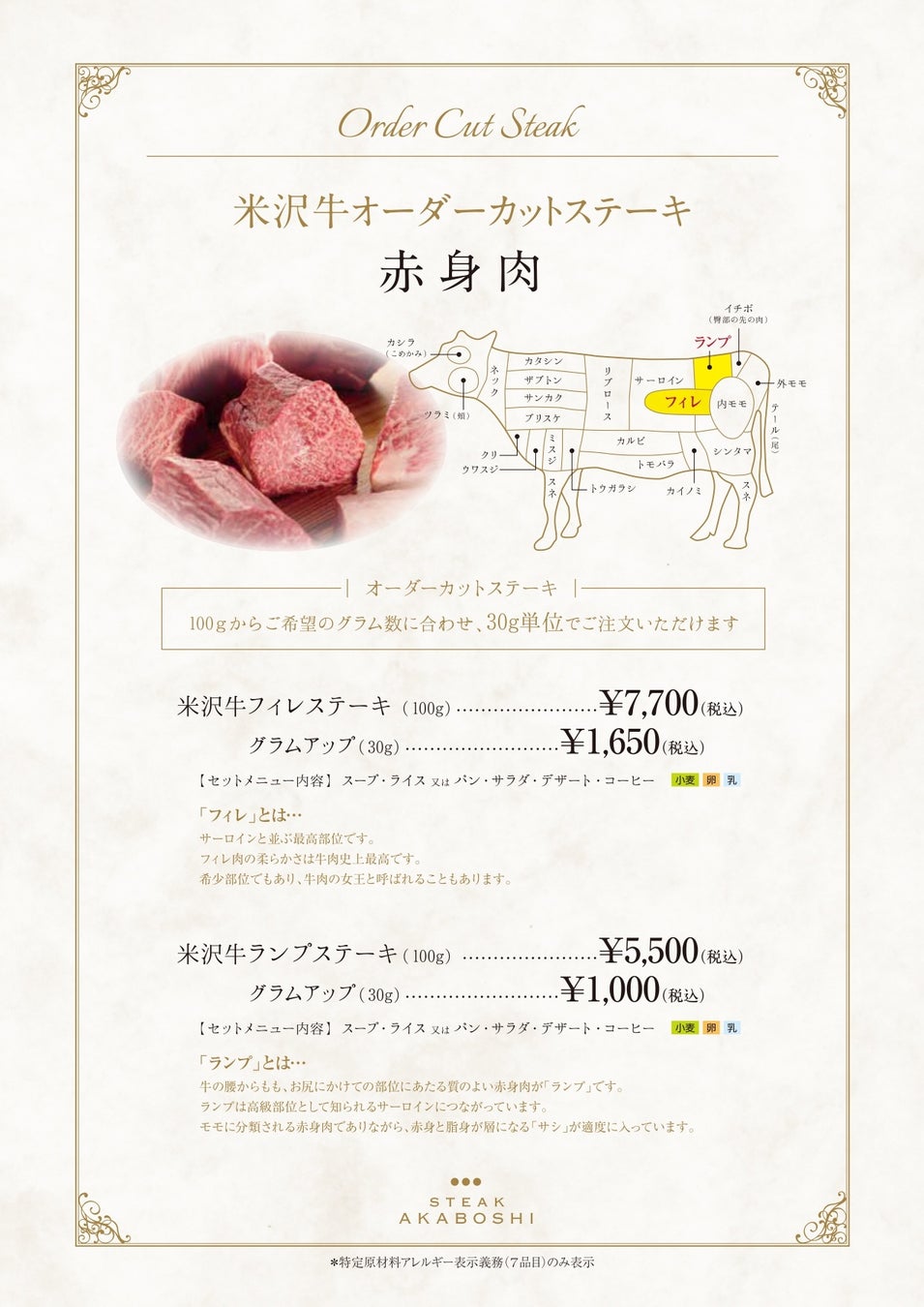 オーダーカットステーキセットは、サーロイン・イチボ・フィレ・ランプ4種の部位から。(5,500円~)