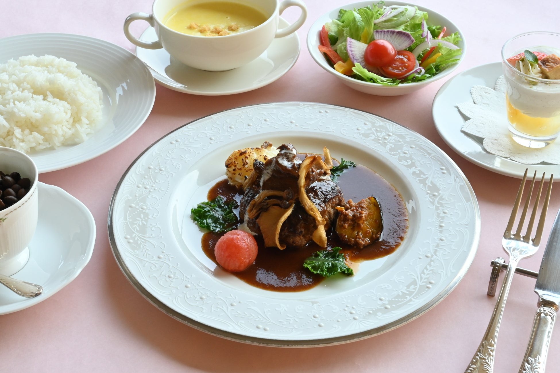 スープ、サラダ、ライスorパン、デザート、コーヒーまでついております。一般的には珍しい、オーダーカットステーキのセットを、「金剛閣」で是非ご堪能下さい。
