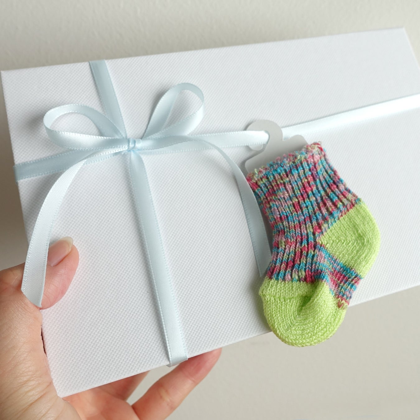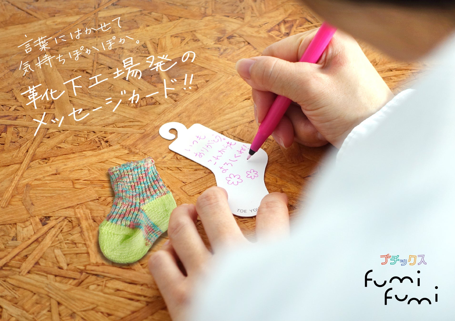 極小靴下「プチックス」と靴下型メッセージカードを組み合わせた「プチックスfumifumi」。お祝いや感謝の言葉をふっくらとした靴下で包み、あたたかな気持ちを届けます。