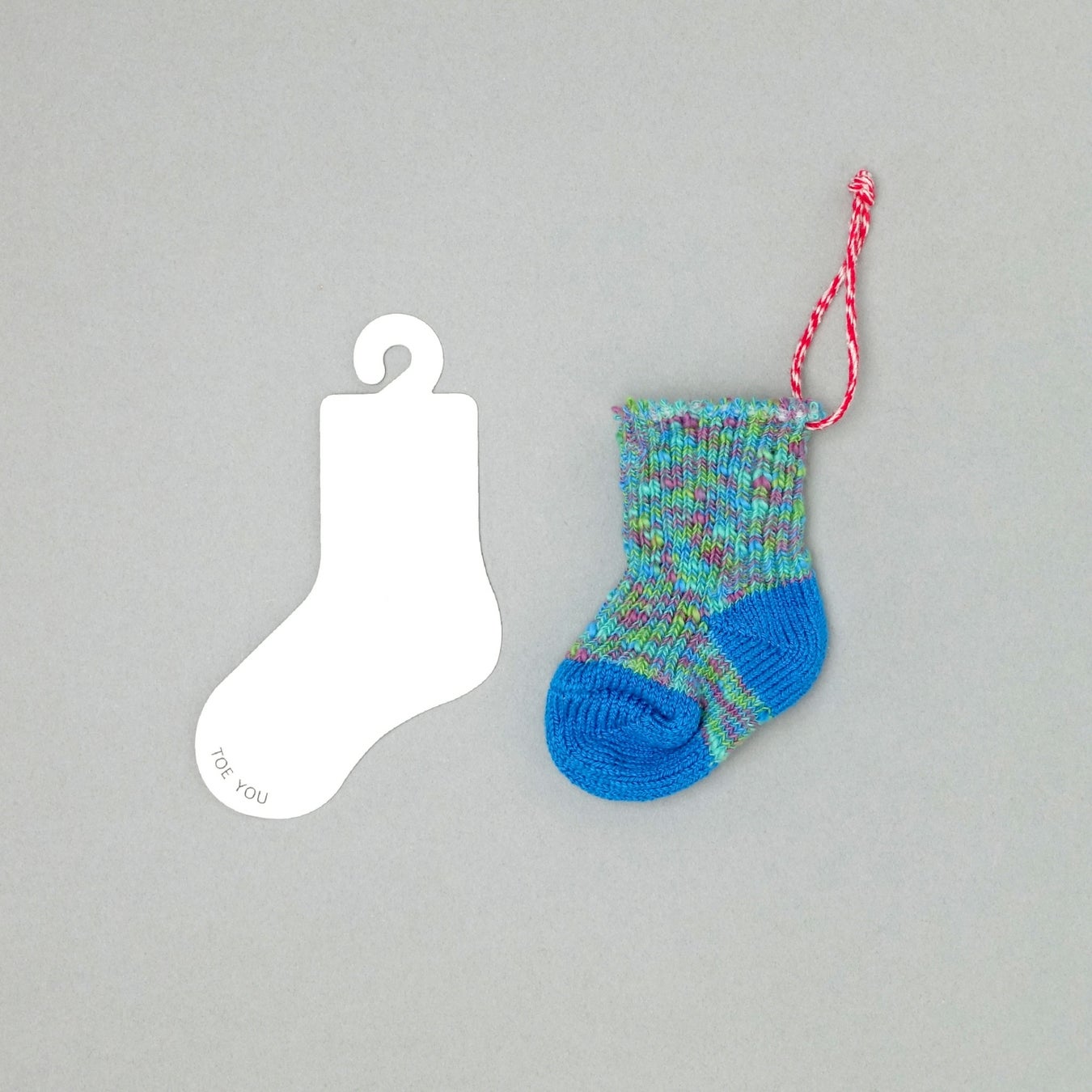 「プチックスfumifumi」は、創喜の靴下職人の遊び心から開発された極小サイズの靴下「プチックス」にぴったり収まる靴下型のメッセージカードです。上部がフック型のカードを「プチックス」に差し込むと、まるで売り場で販売されている靴下のミニチュアのように見えるデザインにしました。つま先(TOE)には「TO YOU」をもじった「TOE YOU(トゥー・ユー)」の文字を印字しています。カードには「ありがとう」や「がんばってね」などの短い文(ふみ)を手書きで添え、「プチックス」を履かせると、ふっくらと編みあげた靴下の質感が、メッセージの想いをやさしく包み込みます。紐が付いているため、ギフトラッピングに直接結び付けることも可能です。贈る相手への気持ちに温かみを添えるアイテムとして、日常からお祝い事など幅広いシーンで活用できます。