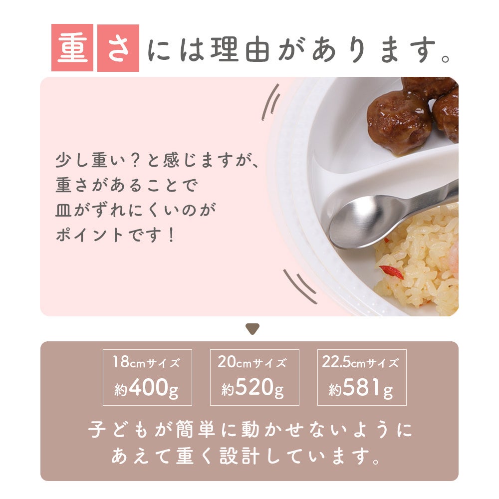 これは、重さがあることでお皿がずれにくくなり、子どもが簡単に動かせないよう、あえて重く設計しているからです。