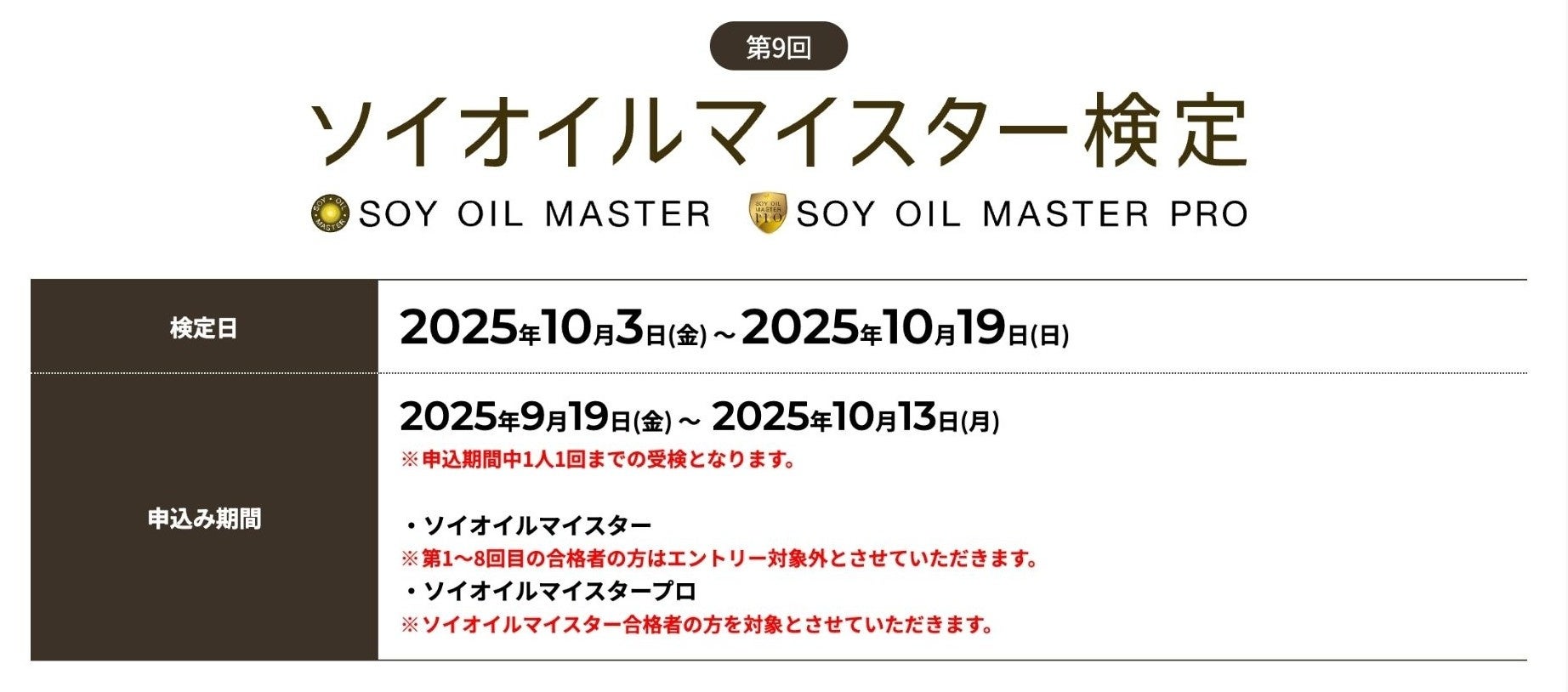 アメリカ大豆輸出協会(USSEC、本部:米国ミズーリ州チェスタフィールド市、日本事務所:東京都港区)は、「ソイオイルマイスター検定」の第9回試験を、2025年10月3日(金)から10月19日(日)まで全国のテストセンターで開催いたします。受検申込期間は、2025年9月19日(金)~10月12日(日)となります。