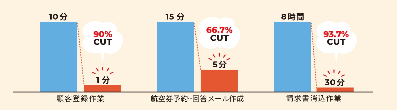 具体的な導入効果として、「本製品の自動取込機能によって、顧客情報の登録時間は10分からわずか1分に短縮され、航空券予約から回答メール作成までのプロセスも15分から5分へと大幅に効率化しました。さらに、手入力がなくなったことでデータ入力ミスが解消されています。また、従来はExcelを使った目視による作業で多大な労力を要していた請求書の消込作業も効率化され、処理時間が8時間から30分へ大幅に短縮することができました」と説明されています。