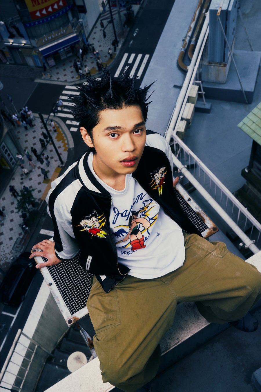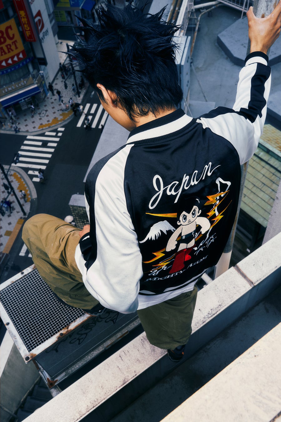 時代を超えて愛される日本のヒーロー「鉄腕アトム」とセレクトショップ「HOMEGAME」によるスーベニアジャケット。左右の胸には足からジェットの炎を吹き出して空を飛ぶアトムの姿、背面にはJAPANの文字、日本列島、富士山とスーベニアジャケットらしい構図にアトムの姿を大胆に刺繍で表現。クラシックなスーベニアジャケットにポップカルチャーの象徴を融合した唯一無二の1着。ファンはもちろん、ファッションアイテムとしても完成度の高い仕上がりのジャケット。