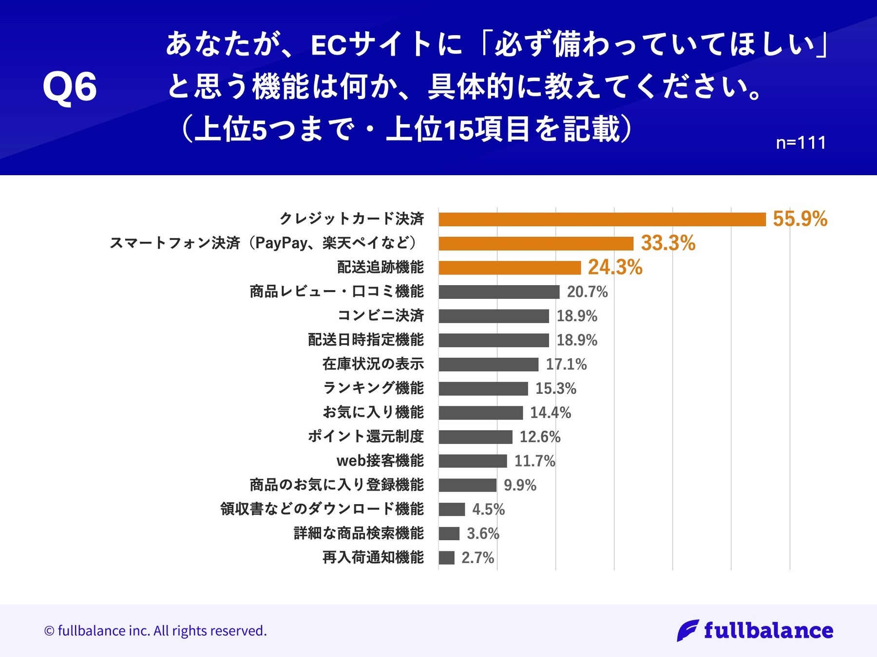 「Q6.あなたが、ECサイトに「必ず備わっていてほしい」と思う機能は何か、具体的に教えてください。(上位5つまで)」(n=111)と質問したところ、「クレジットカード決済」が55.9%、「スマートフォン決済(PayPay、楽天ペイなど)」が33.3%、「配送追跡機能」が24.3%という回答となりました。