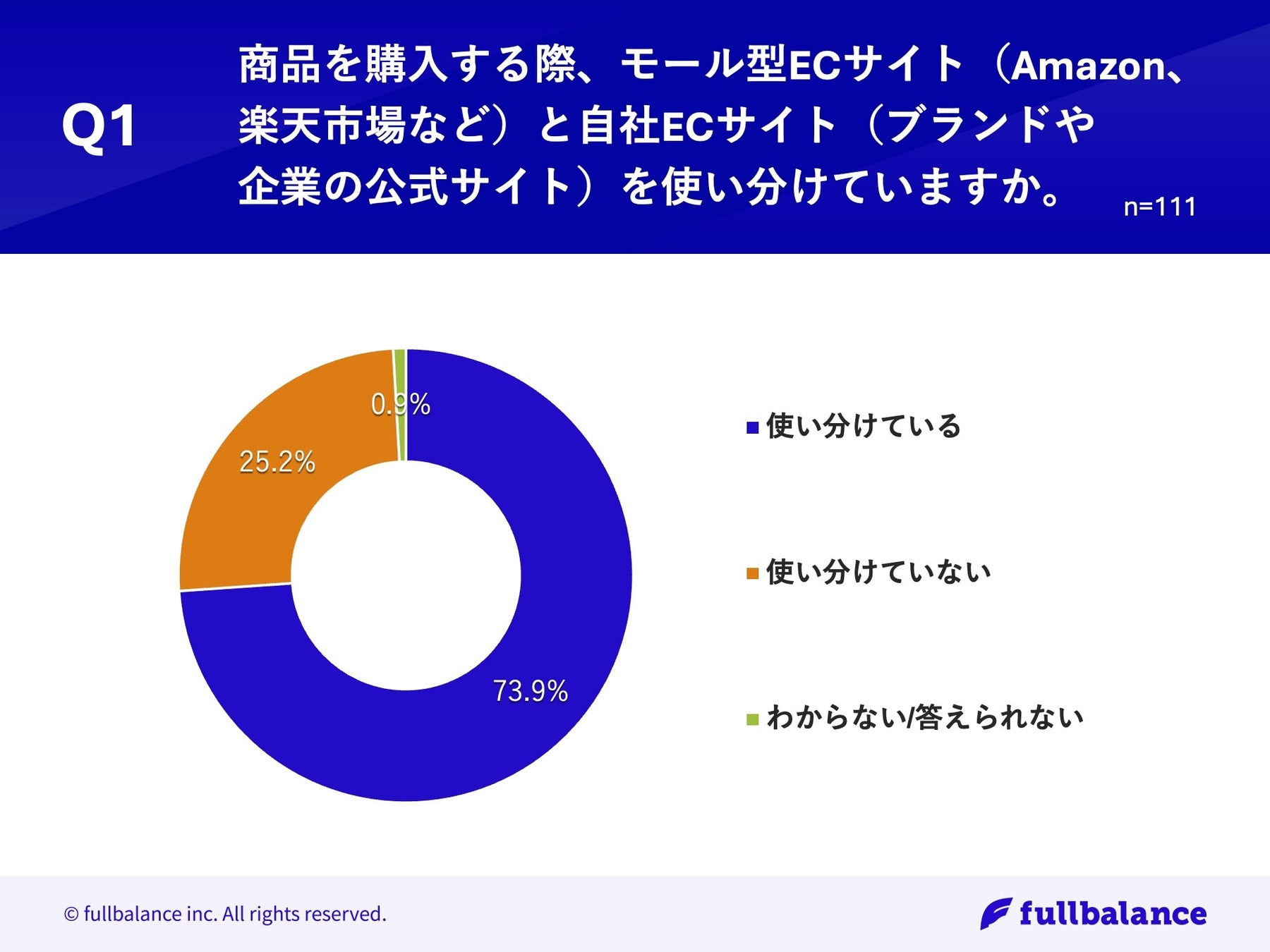 「Q1.商品を購入する際、モール型ECサイト(Amazon、楽天市場など)と自社ECサイト(ブランドや企業の公式サイト)を使い分けていますか。」(n=111)と質問したところ、「使い分けている」が73.9%、「使い分けていない」が25.2%という回答となりました。