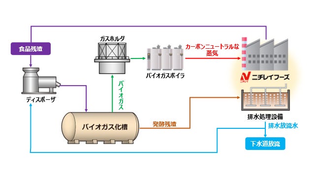 「D-Bioメタン」は、食品工場などで発生する食品残渣を発酵させ、メタンガスを生成するオンサイト型バイオガス化システムです。冷凍食品製造を行う本工場では、食品残渣から生成したメタンガスを燃料とし、バイオガスボイラで発生させたカーボンニュートラルな蒸気を製造工程で有効利用します。本取り組みにより、動植物性残渣が大幅に減容される見込みであり、サーキュラーエコノミーの実現に貢献します。さらにカーボンニュートラルな蒸気の利用により、年間で約40トンのCO2排出量の削減効果を見込んでいます。