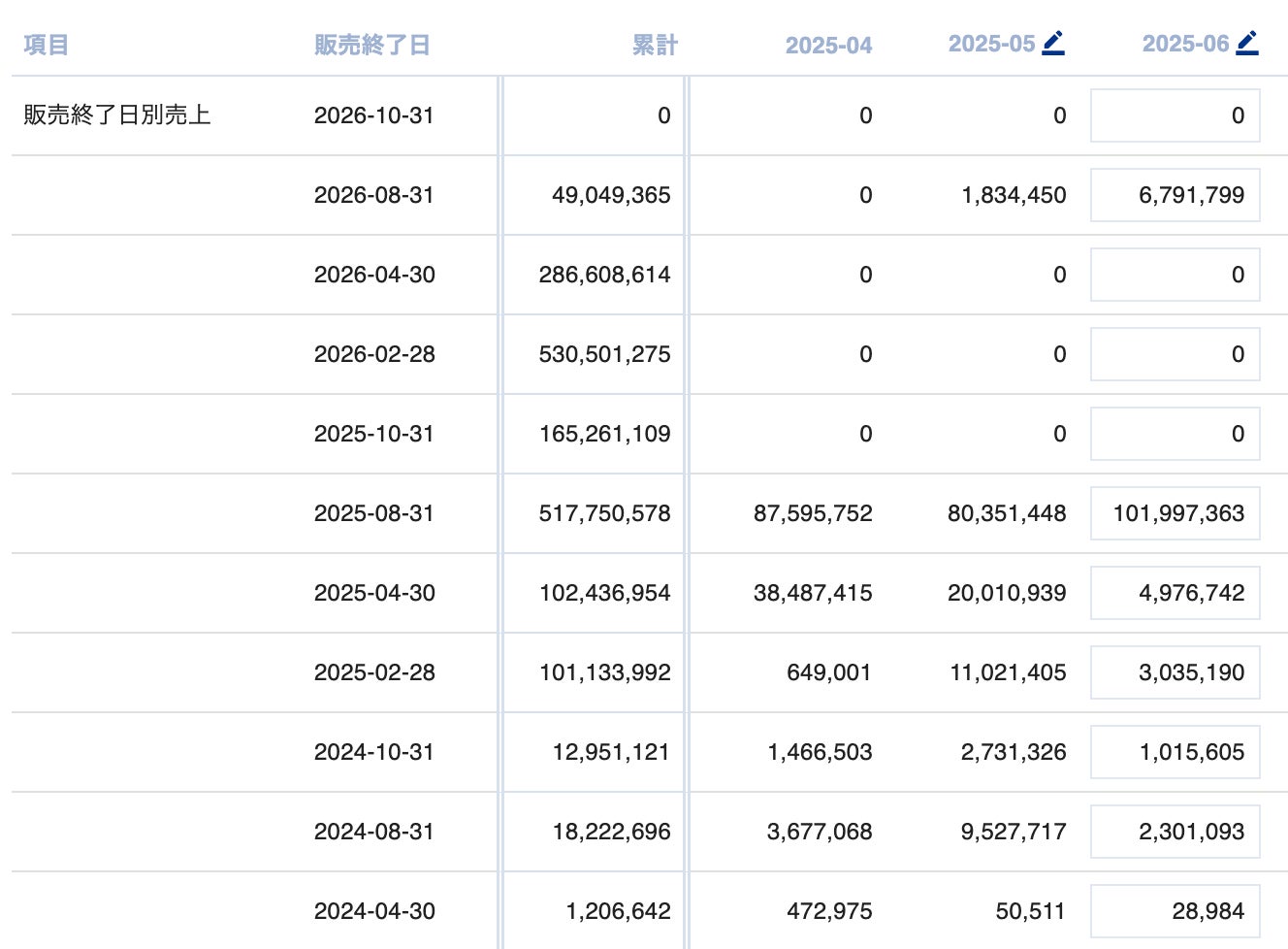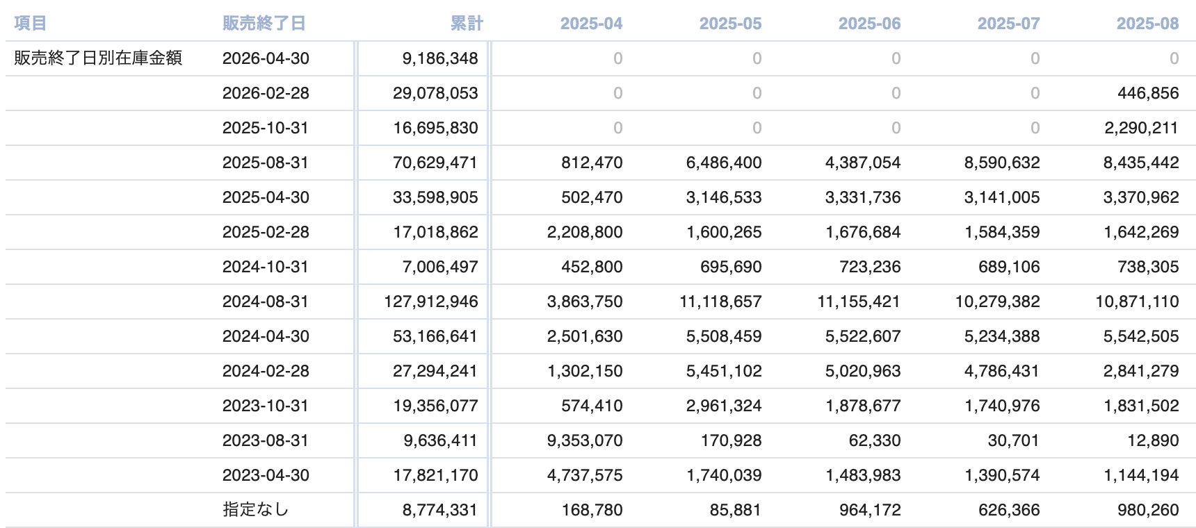 例えば2025年夏物の在庫は現状の進捗であれば順調に消化しきれるのかといった点も昨年度の販売動向・仕入動向を元に自動で将来の在庫金額を予測し、見通しが入力されます。販売終了日別の売上・粗利率・仕入金額の見通しを変更することで、先々の在庫金額の見通しも自動で修正されるため、期末までに夏物在庫を目標金額まで削減できそうかどうかが一覧で確認することが可能です。