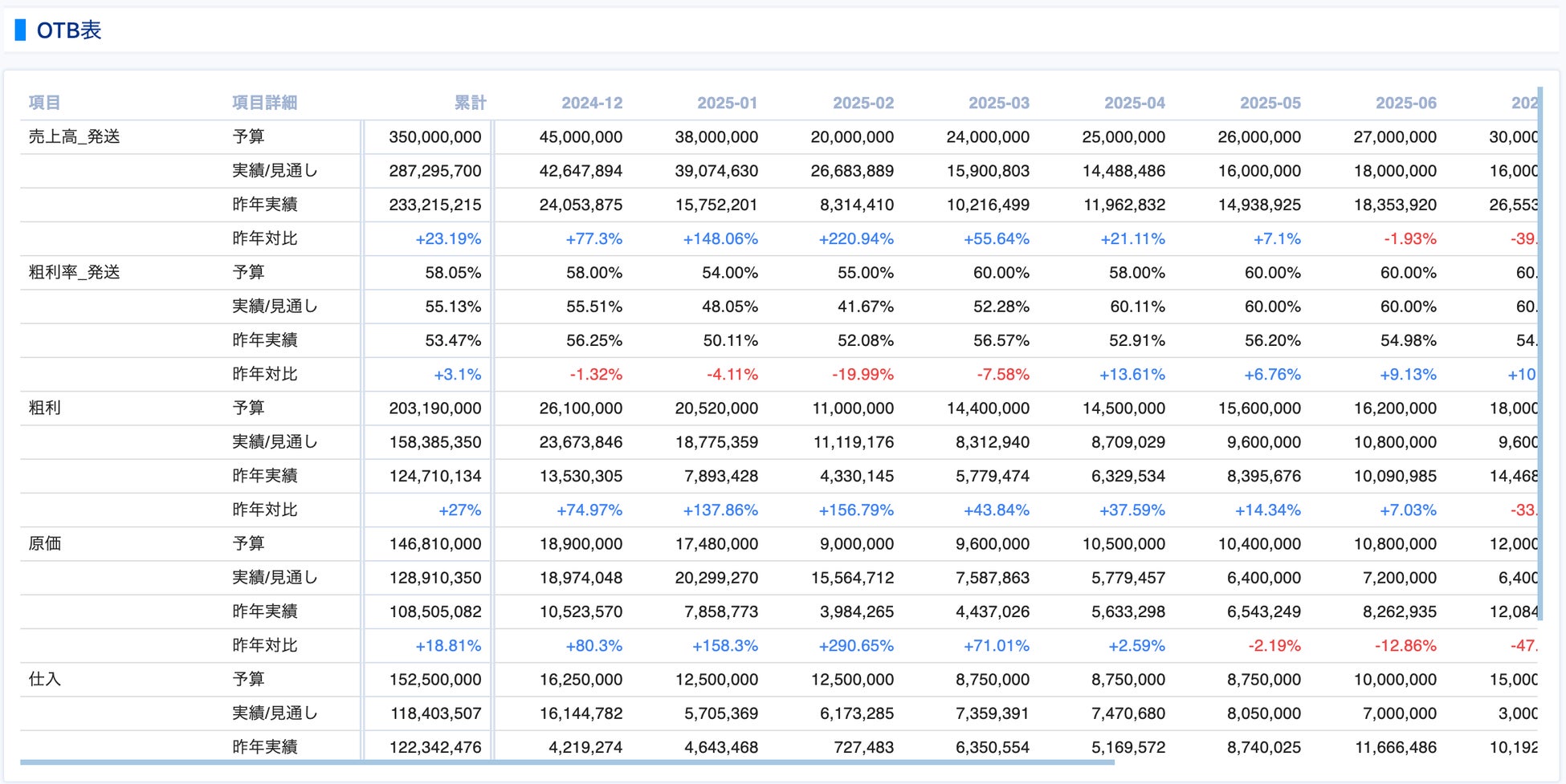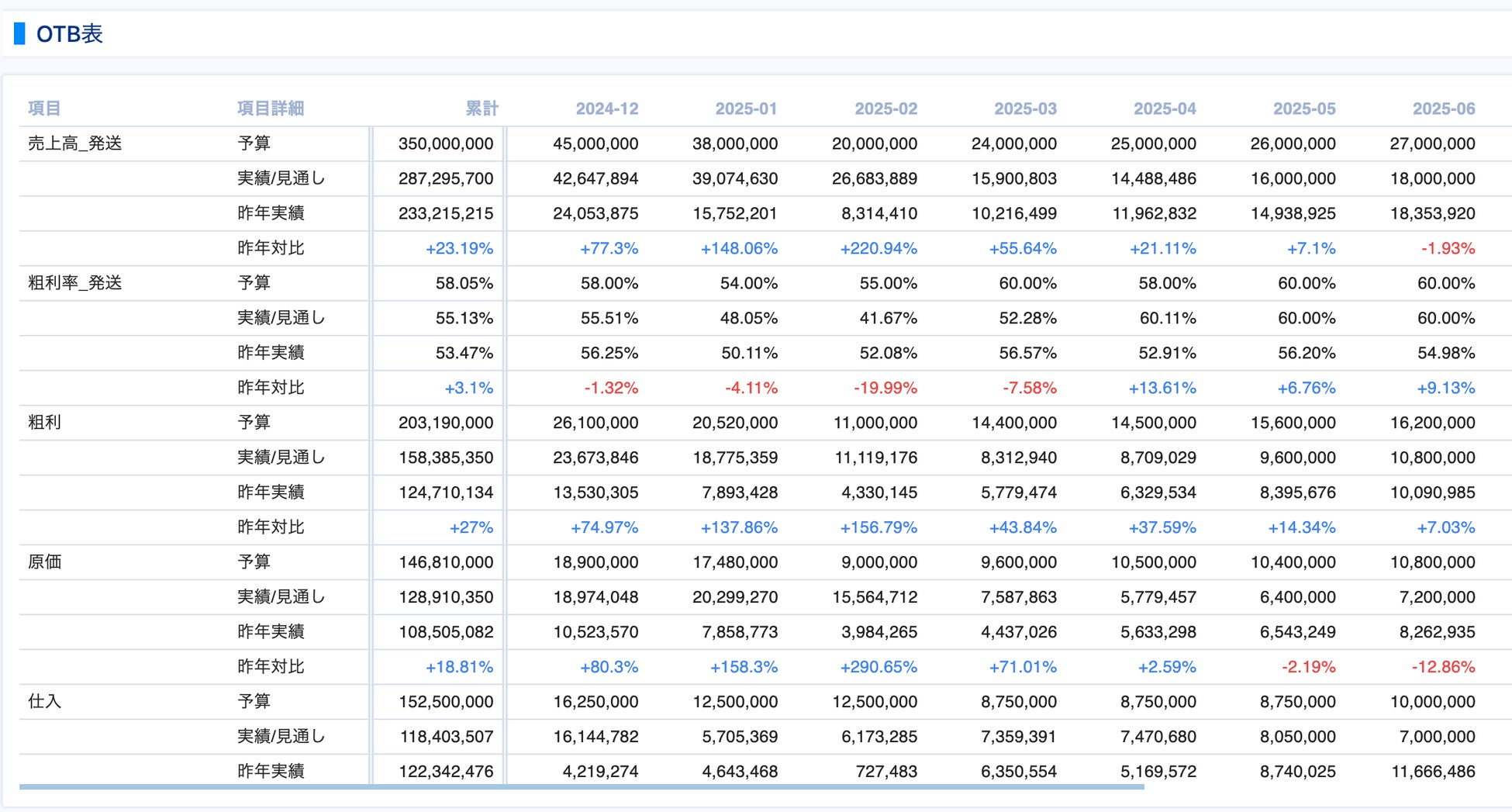 今回リリースされたOTB管理機能では、昨年の実績は自動で入力され、今年の実績・見通しを入力することで、販売終了日別の売上・粗利率・粗利額・原価・仕入・在庫金額を自動で算出・可視化できます。これにより、Excelでの煩雑な集計作業を不要にし、本質的な分析や判断に時間を割けるようになります。また、販売終了日別の数値を修正すると全体の数値も自動で再計算される仕組みとなっており、見通しの調整も柔軟に行えます。