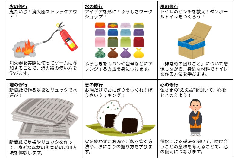 プログラム:お寺を舞台にした6つの修行(火・水・風・地・恵・心)をめぐりながら、防災を体験できる内容のスタンプラリー型ワークショップです。全ての修行を達成すると、特典を進呈します。