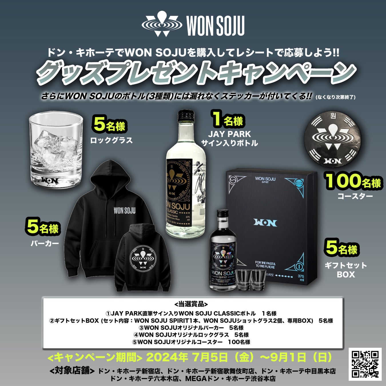 ドン・キホーテのWON SOJUの取り扱い開始決定に伴い、購入レシートで応募し抽選でグッズが当たる特別なキャンペーンの実施が決定。また、この期間中は店頭に並べられているボトルにはオリジナルステッカーが漏れなく付属するとのことだ。(ステッカー付属はなくなり次第終了)