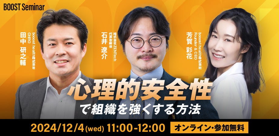 Boost Health株式会社(東京都中央区、代表取締役CEO・創業者:芳賀彩花)は、12月4日(水)に株式会社ZENTech代表取締役 石井遼介氏をゲストに迎え、「心理的安全性で組織を強くする方法」をテーマに、BOOST Seminarを開催します。