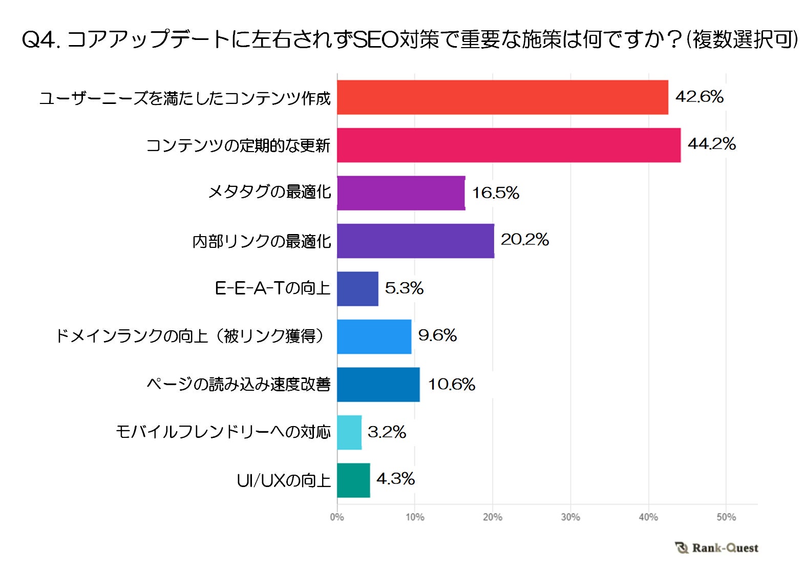 最も多かった回答は「コンテンツの定期的な更新」で、全体の44.2%を占めました。次いで「ユーザーニーズを満たしたコンテンツ作成」が42.6%となり、質の高いコンテンツの継続的な提供がSEO対策において特に重要視されていることがわかります。これらの結果は、Googleコアアップデートに対しても安定した効果をもたらすためには、ユーザーが価値を感じられるコンテンツ戦略が不可欠であることを示唆しています。