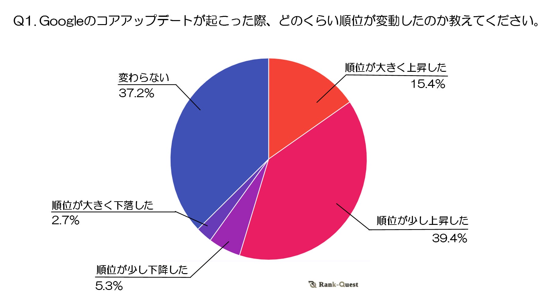 最も多かった回答は「順位が少し上昇した」で、全体の39.4%を占めました。次に多かったのは「変わらない」で37.2%、コアアップデートの影響がなかったサイトも多く見られました。また、「順位が大きく上昇した」と答えた人が15.4%いることから、一部のサイトではアップデートによるポジティブな影響が顕著だったことがわかります。一方、「順位が少し下降した」5.3%、「順位が大きく下落した」2.7%という結果は、特定のサイトや業種がネガティブな影響を受けやすい可能性を示唆しています。