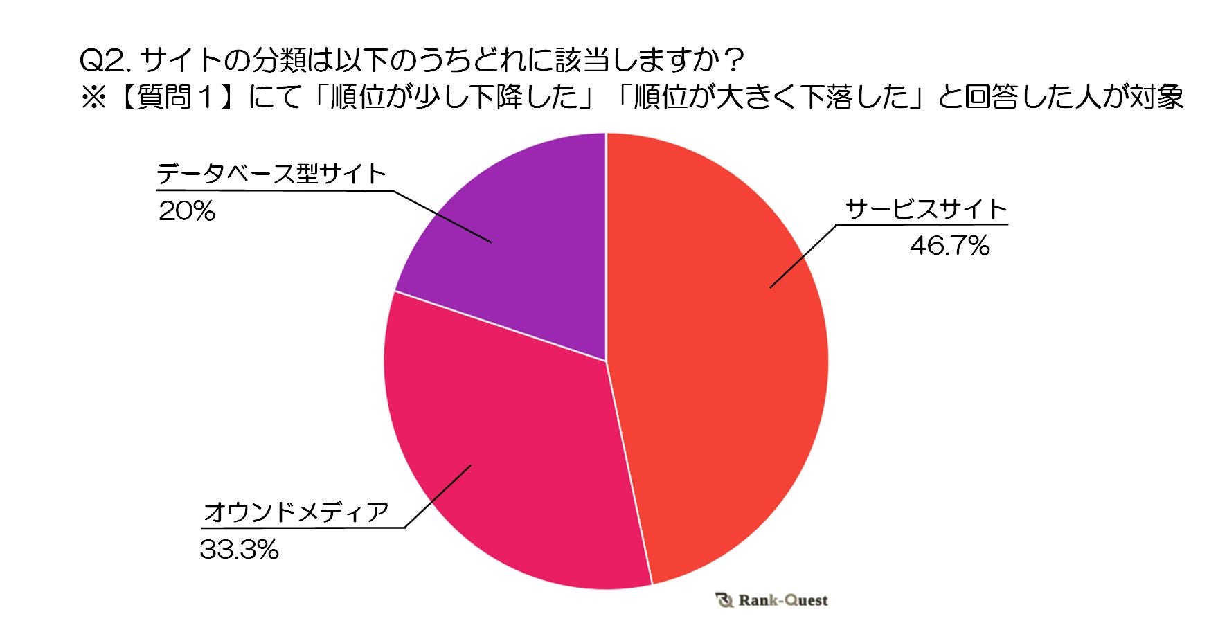 最も多かった回答は「サービスサイト」で46.7%を占めました。次に多かったのは「オウンドメディア」で33.3%、続いて「データベース型サイト」が20%でした。これにより、Googleコアアップデートの影響を受けやすいサイトの傾向として、特にサービスサイトやオウンドメディアが挙げられることがわかります。