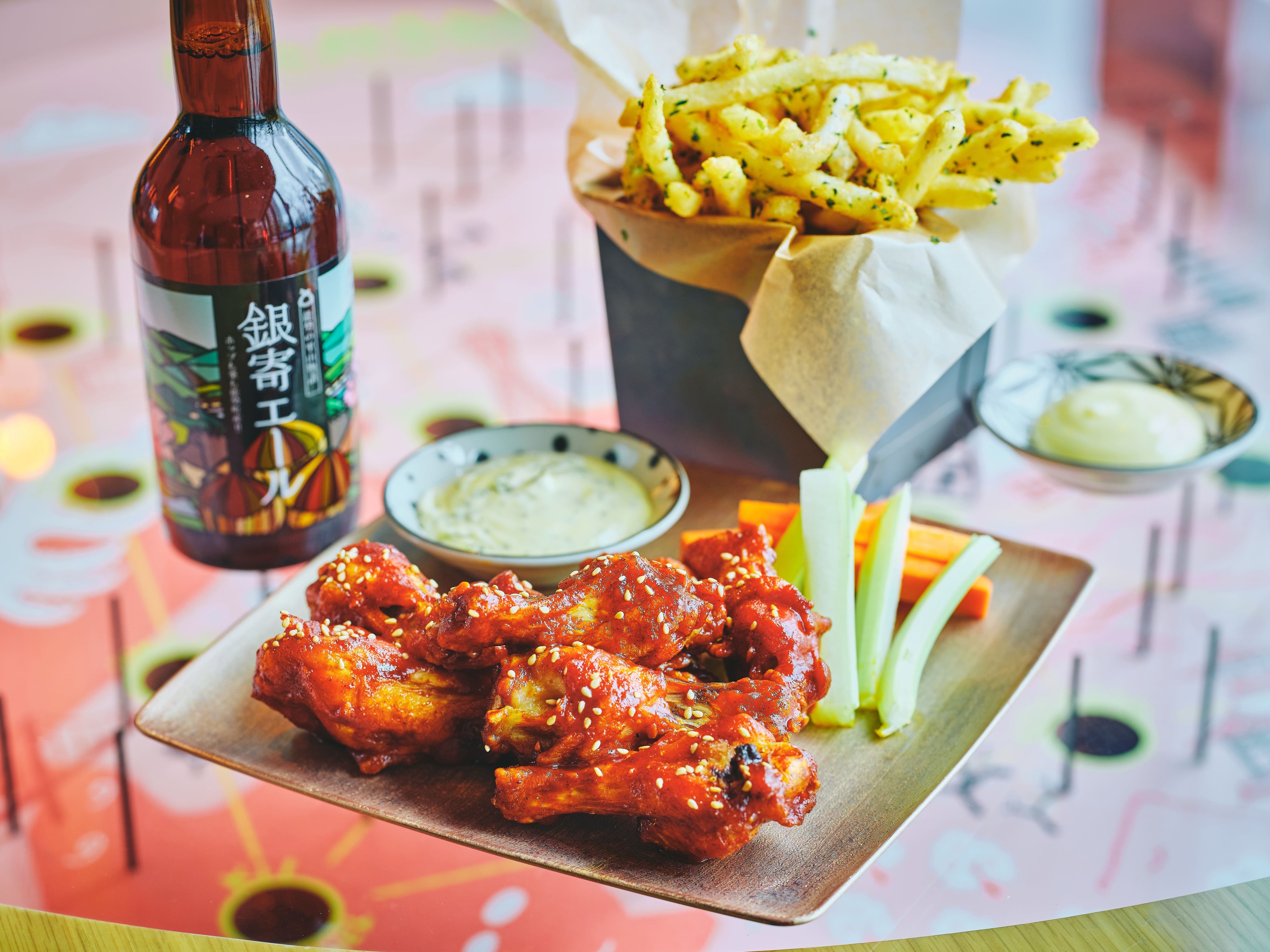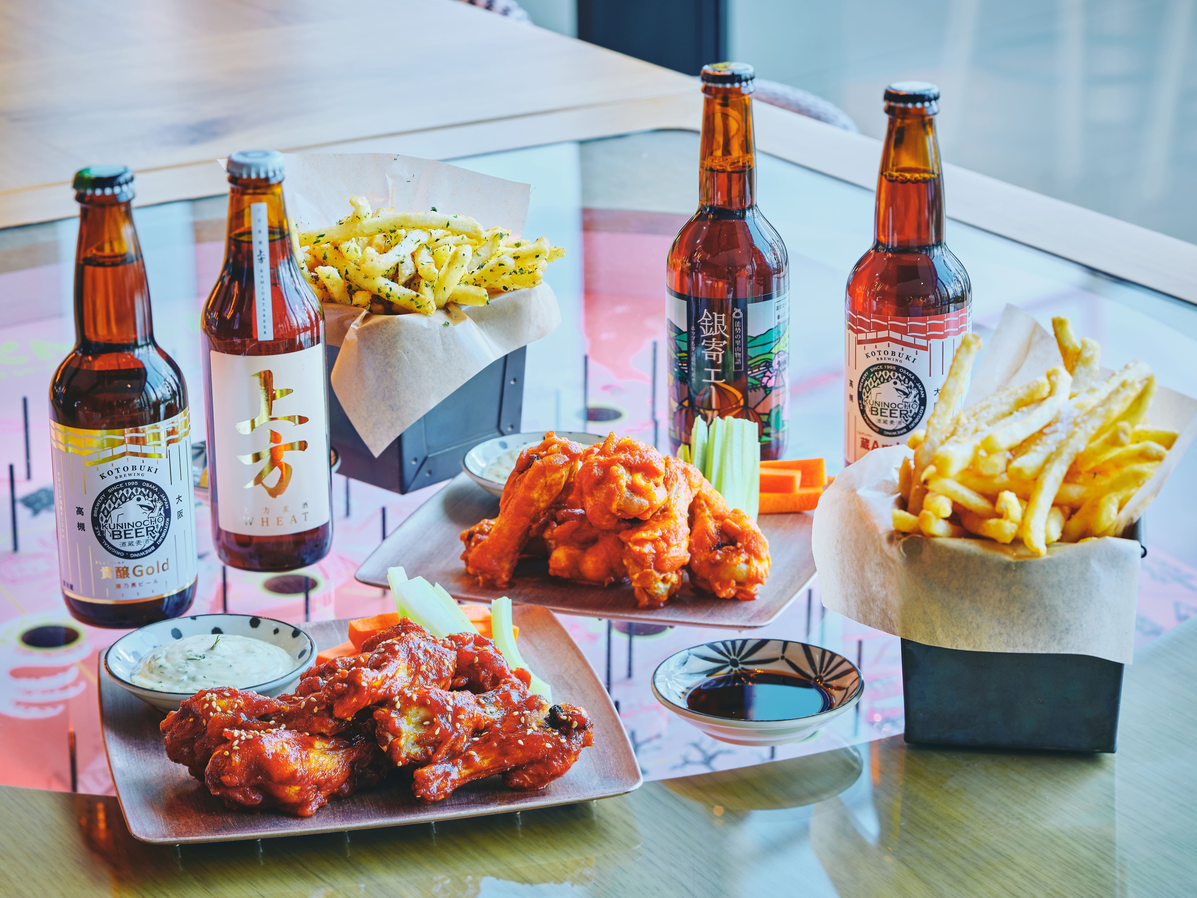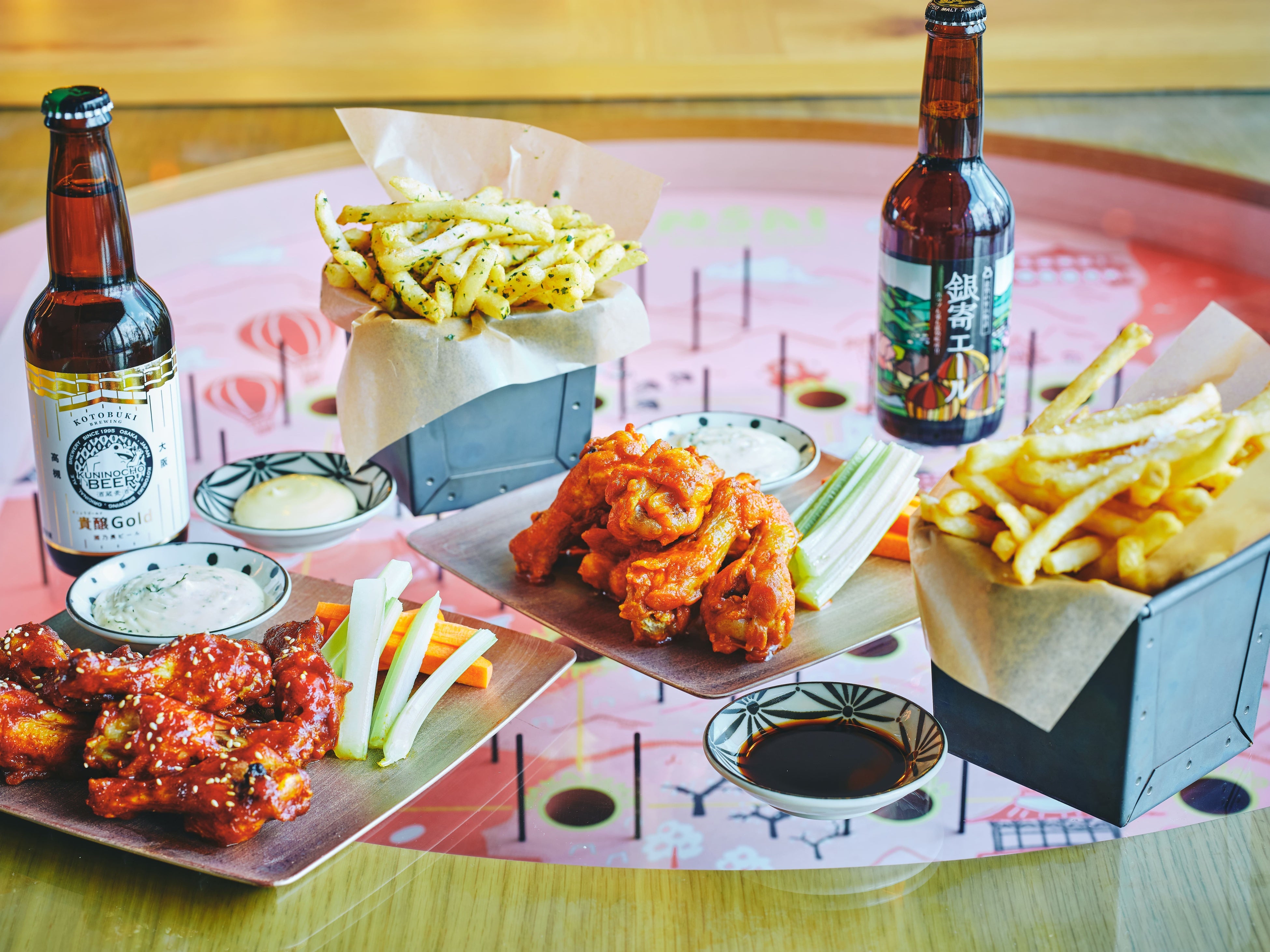 クラフトビールに合わせた料理には、大阪の「ヘルメスソース」にピンクペッパーコーンの軽やかな刺激を加えた「スローローストポークバーガー」や、大阪名物のたこ焼きやだし巻き卵のフライを挟んだ「!JaJa! タコス」、3種のチキンウィングなど、全11品をご用意。アラカルトまたはセットメニューでお召し上がりいただけます。
