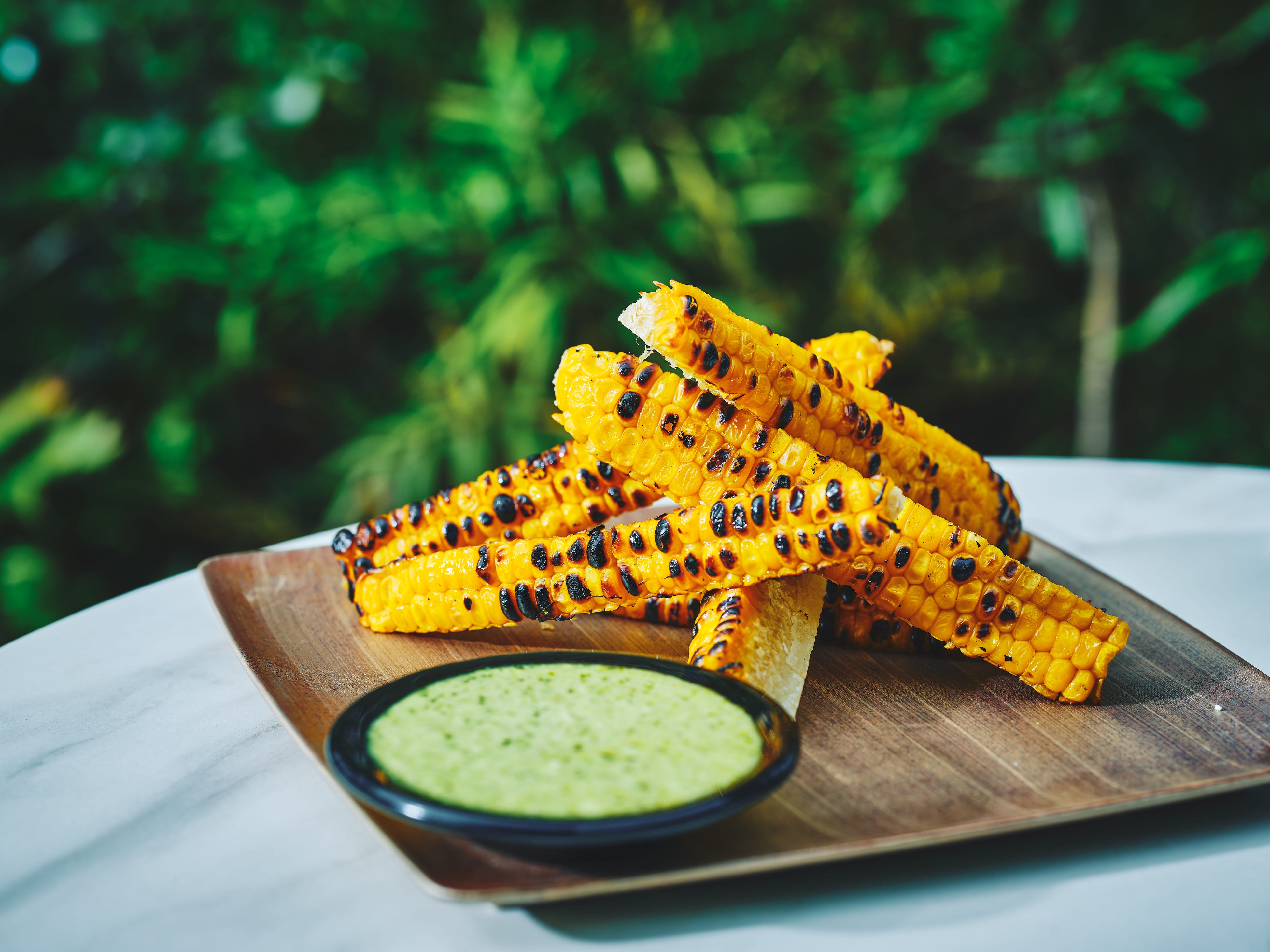 スパイス風味のコーンリブ、グリーン・ゴッデスソース添え(2,100円)