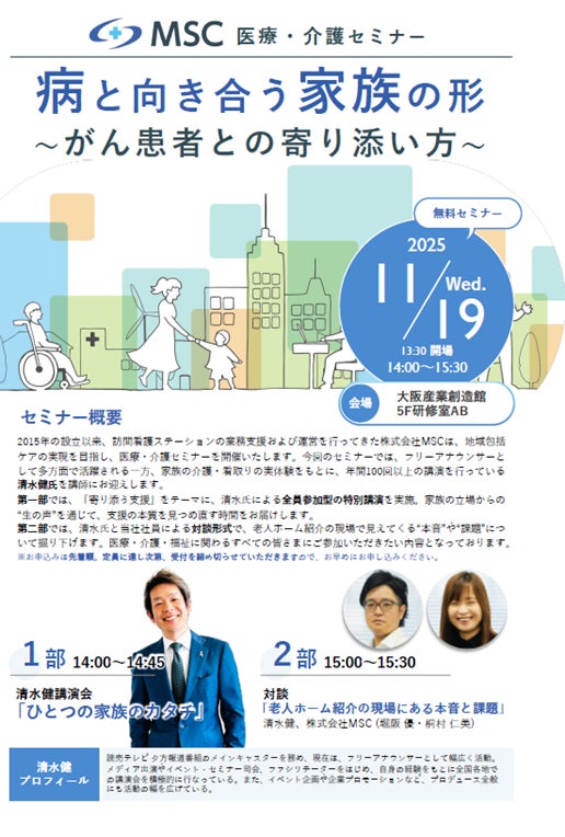 在宅医療・介護で地域を支えてきた株式会社MSC(本社:大阪市)は、創業10周年を迎え、地域包括ケアの実現を目指して医療・介護セミナーを2025年11月19日(水)に開催いたします。本セミナーでは、フリーアナウンサーとして幅広く活躍し、ご家族の介護・看取りの実体験をもとに年間100回以上の講演を行っている清水健氏を講師にお迎えします。