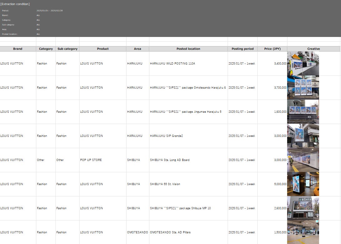 ・OOH TrendBaseは屋外広告の統計データ・画像システムで、表参道、渋谷、原宿、銀座、六本木を中心に、流行の先端となる都内主要約80地点を毎週モニタリングし、広告画像、出稿情報、媒体費等をデータベース化