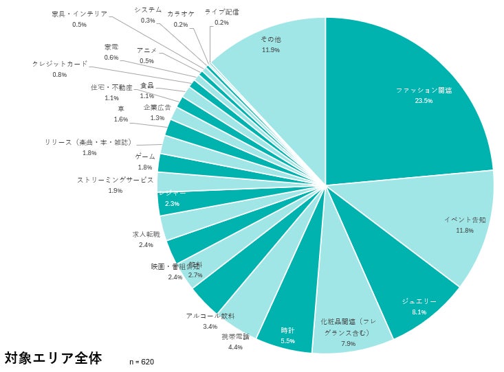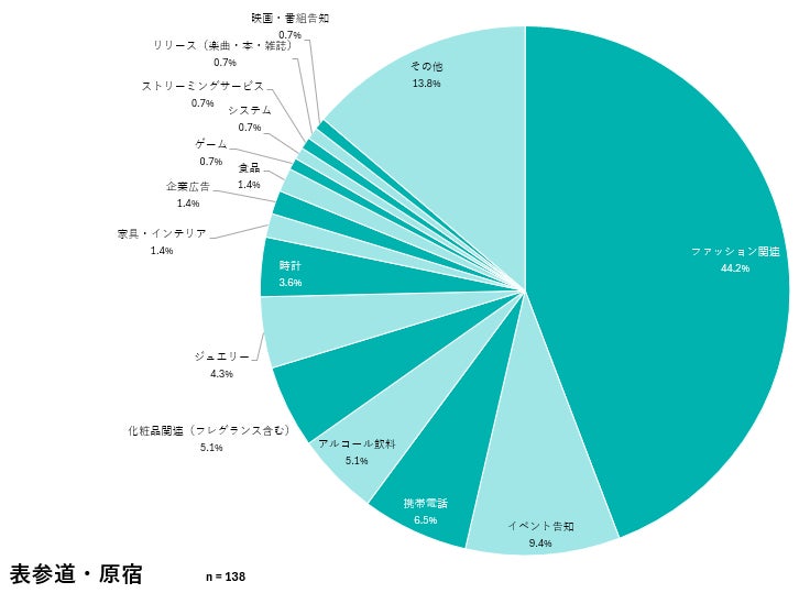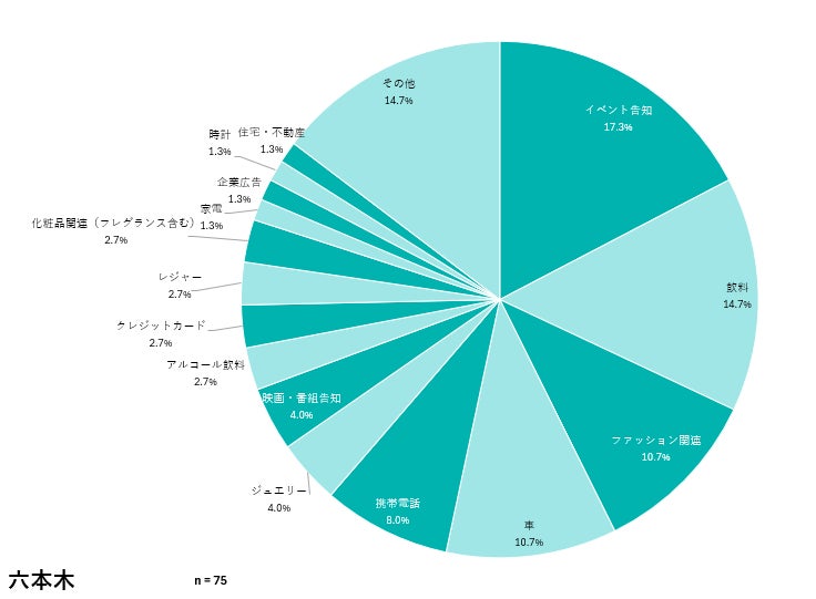 表参道、渋谷、原宿、六本木、銀座など流行感度の高いエリアをモニターしていることもあり、また、年末の華やかな時期も重なり、ファッション関連(特にラグジュアリーブランドの出稿)がトップ、次いでイベント告知ではあったが、ラグジュアリーブランドのポップアップイベント告知などが半数を占めていた。