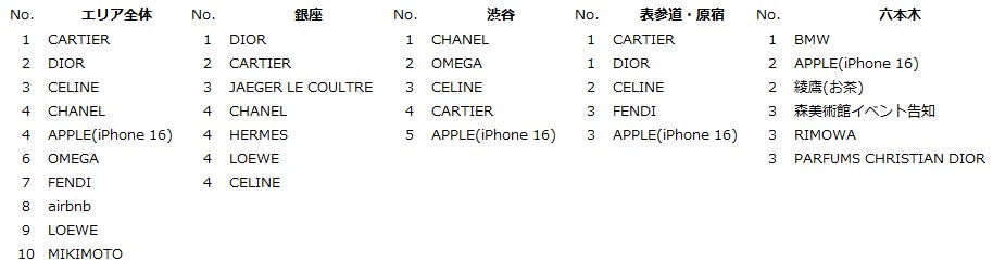 エリア全体、エリア別いづれもラグジュアリーブランドがランキングの大半を占めている。