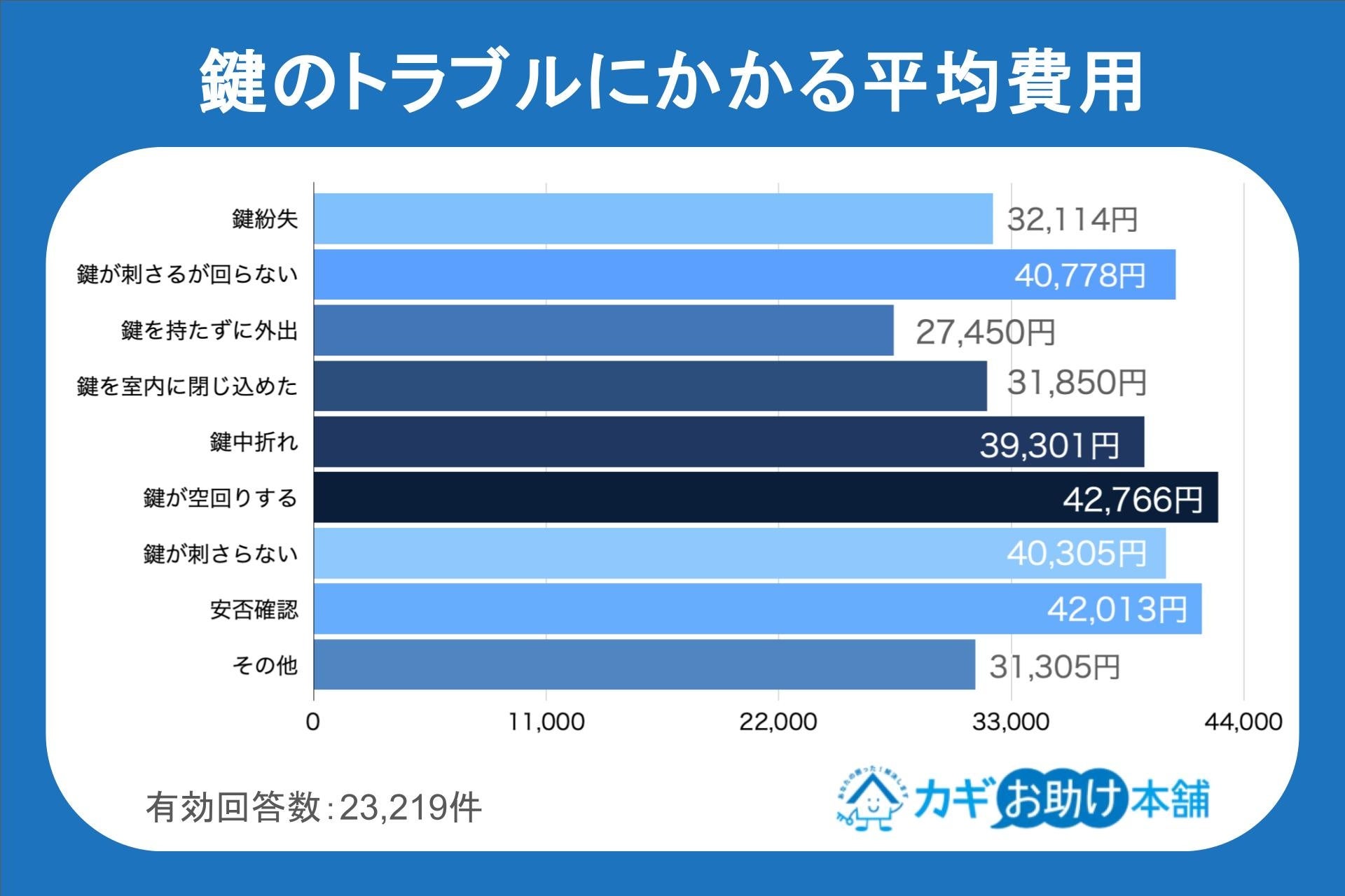 一方、「鍵が刺さるが回らない」は平均40,778円、「鍵が空回りする」は平均42,766円、「鍵が刺さらない」は平均40,305円でした。