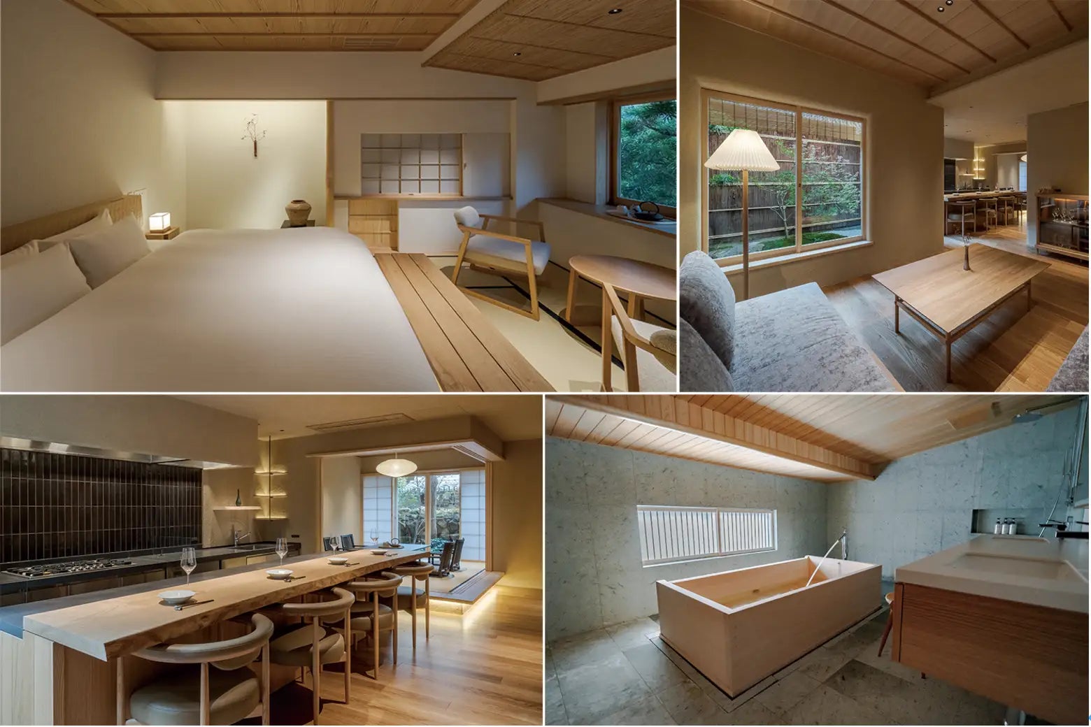 伝統的な木造二階建ての建物には、一階にプライベートシェフを招くこともできるキッチンとカウンター席、その隣の空間には掘りごたつの和室を設えています。さらに奥には、庭を望むミニバーを備えたリビングがあり、寛ぎの時間をお過ごしいただけます。二階には、ゆったりとしたキングサイズのベッドルームと、檜の香りを楽しめる広い浴槽を設け、心地よいひとときをお愉しみいただけます。