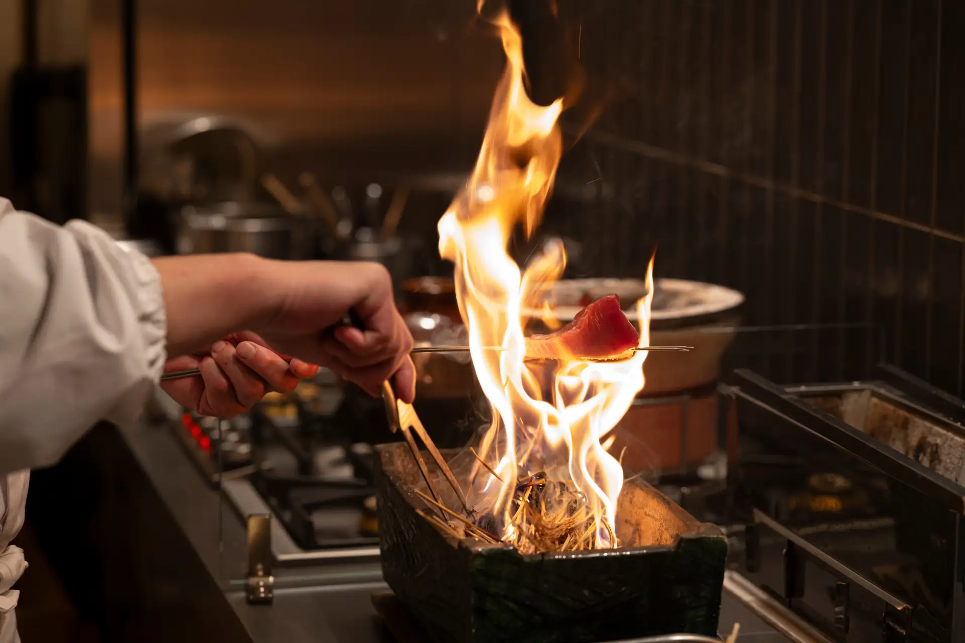 「季楽 邸 清水」では、宿の特徴であるキッチンとカウンター席を活かし、プライベートシェフを招いた食の体験をご用意しています。肉割烹、会席、割烹など、京都で腕を磨くシェフによる複数のジャンルから選ぶことができ、邸宅の中で静かに味わう、ここだけの時間をお届けします。