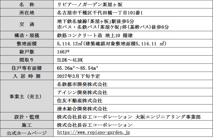 名鉄都市開発株式会社(本社:愛知県名古屋市中村区・代表取締役社長 日比野 博)、アイシン開発株式会社(本社:愛知県刈谷市・代表取締役社長 中村 武司)、住友不動産株式会社(本社:東京都新宿区・代表取締役社長 仁島 浩順)、清水総合開発株式会社(本社:東京都中央区・代表取締役社長 新井田 雅之)は、コカ・コーラボトラーズジャパン事業所跡地開発の第一弾プロジェクトとして、千種区千代田橋一丁目に新築分譲マンション「リピアーノガーデン茶屋ヶ坂」(以下、本計画)について、共同で開発・分譲することを発表いたします。