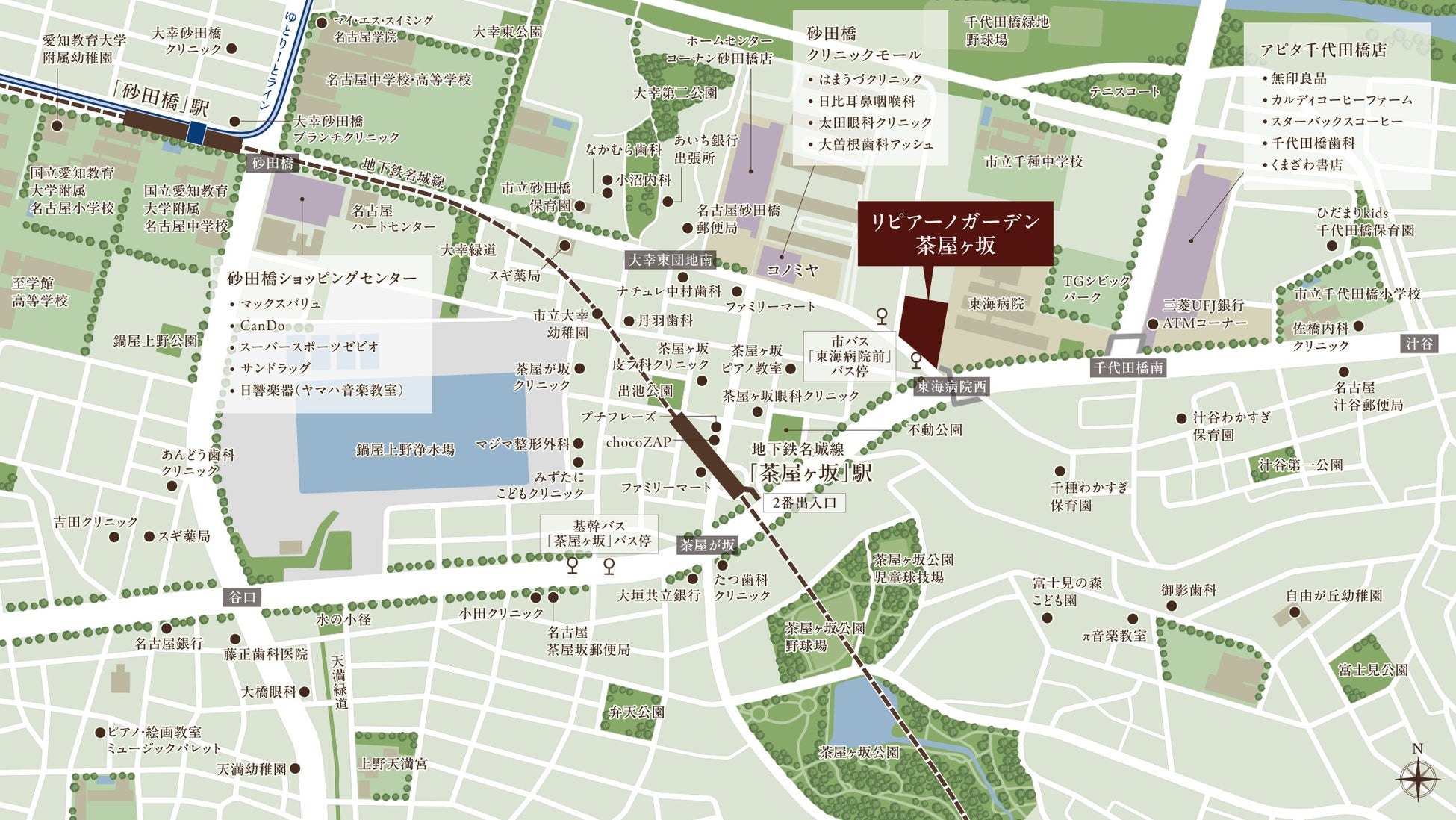本計画地は、地下鉄名城線「茶屋ヶ坂」駅から徒歩5分の千種区千代田橋一丁目に建設されます。開発が進む栄をはじめ、IGアリーナ・名古屋市役所・名古屋大学など市内各スポットの最寄り駅へ直通し、通勤・通学・買い物などに便利なアクセス性を持ちます。